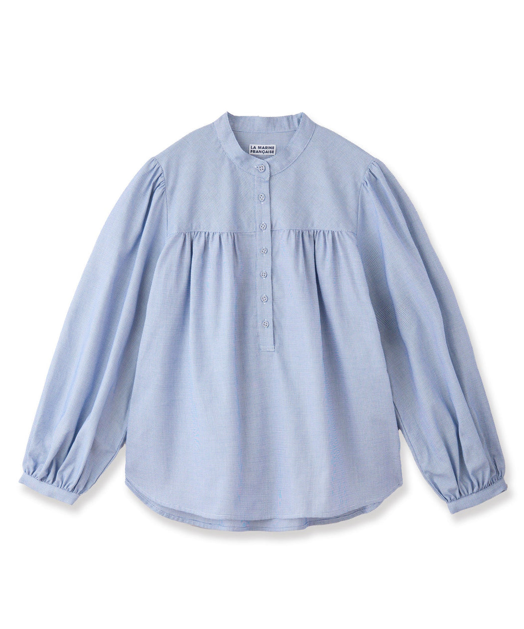 シンプルながらも上品な印象のスタンドカラーと、柔らかく広がる袖がフェミニンさを演出。