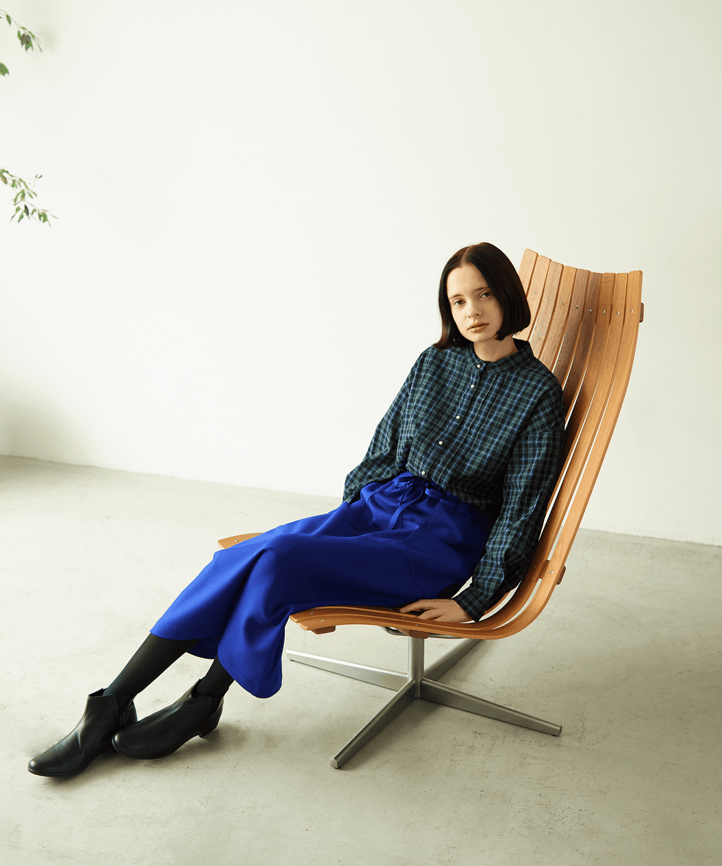 フロントタックの華やかさを活かすため、シンプルなテーパードパンツと合わせて、オフィスやきれいめカジュアルに。