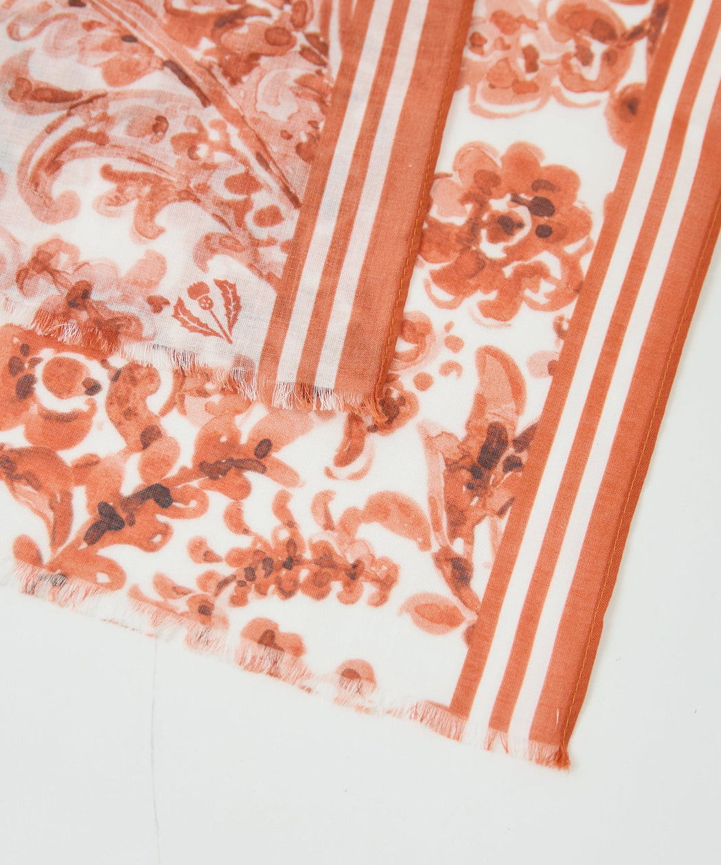 繊細な模様と落ち着いた配色が魅力で、装いに上品なアクセントを添えてくれます。軽やかでやわらかな素材感で、肌あたりもなめらか。首元にふんわり巻くだけで、コーディネートに奥行きと華やぎをプラスします。