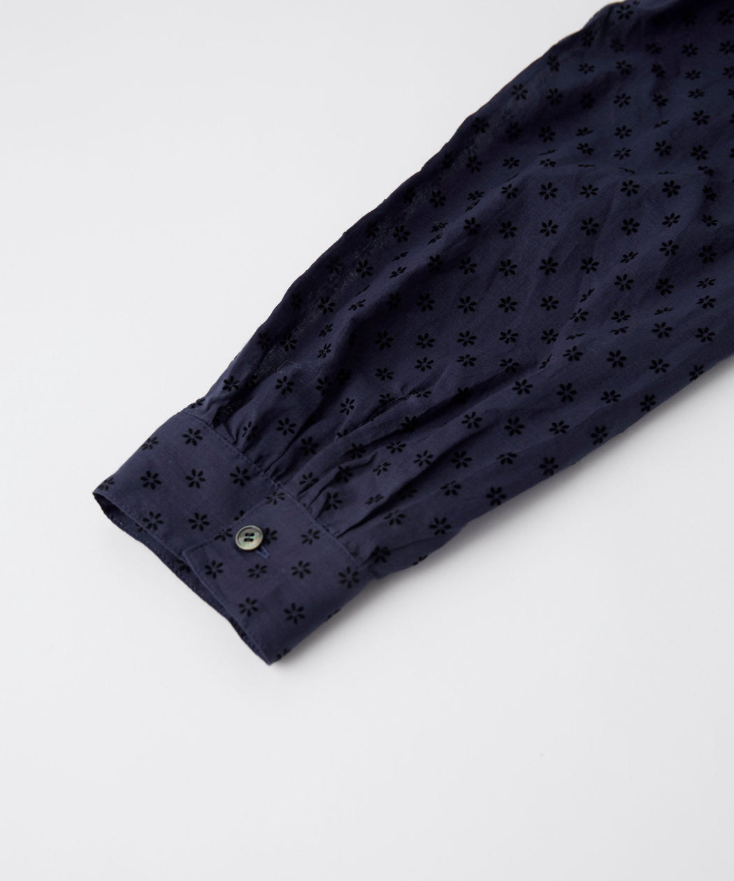 華やかさと上品さを兼ね備えた、フロッキープリントブラウス