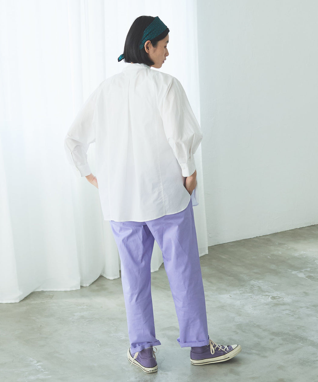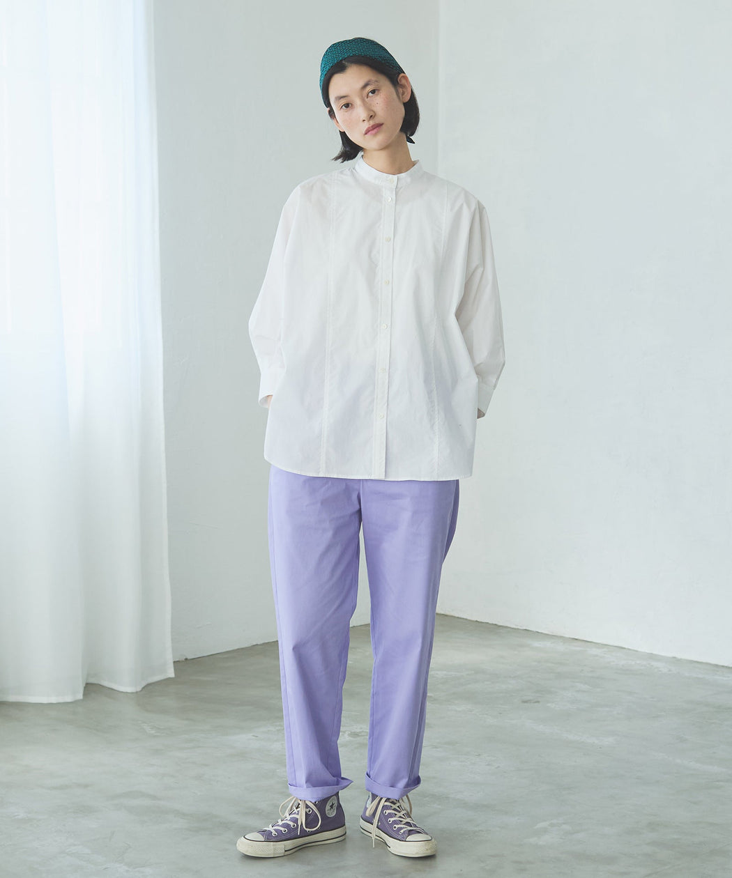 ラベンダーやブルーなどカラーアイテムは、白やベージュのシャツやブラウスと合わせて爽やかに。
