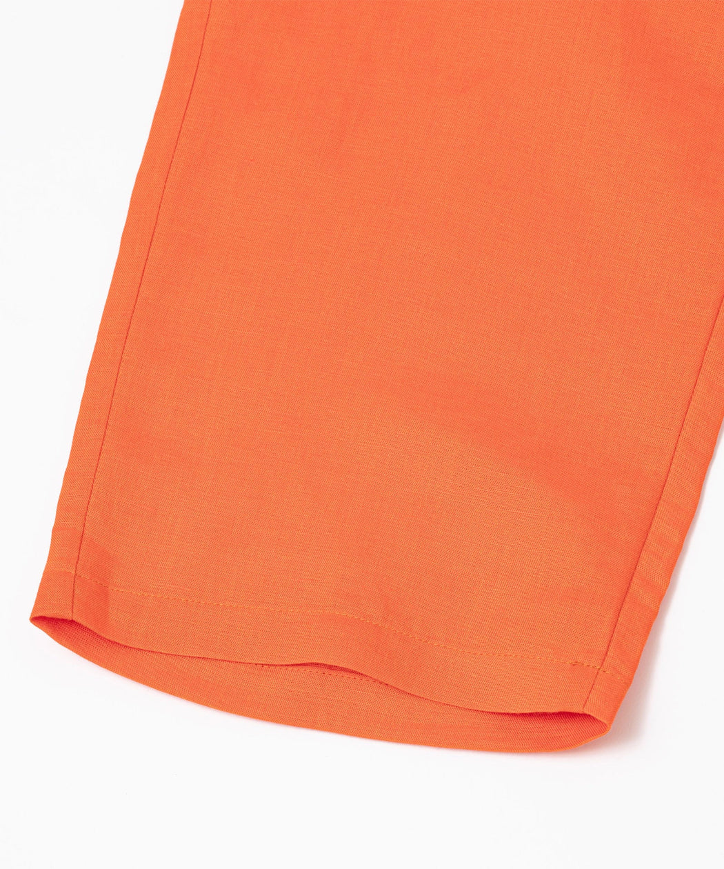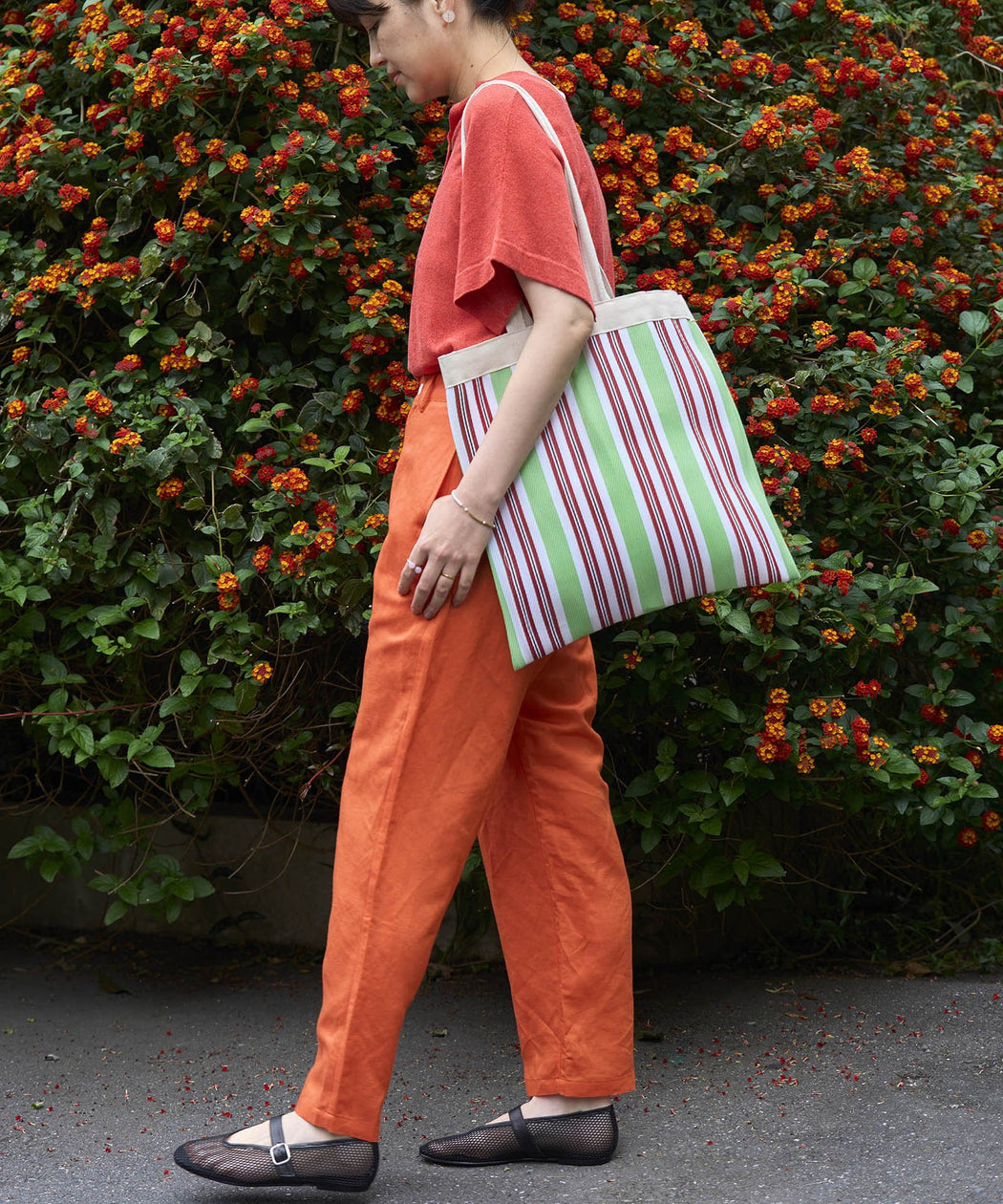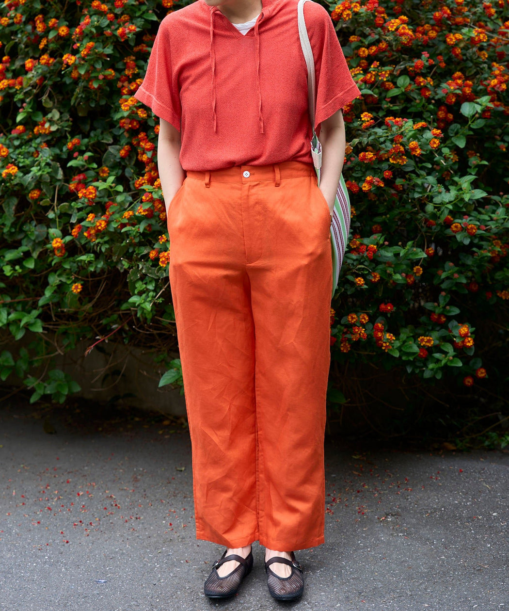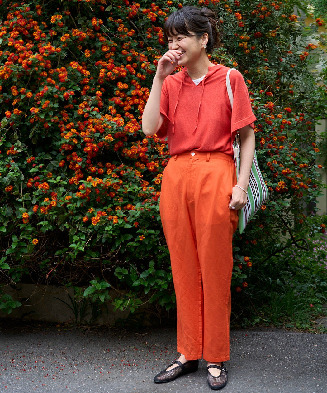オレンジパンツを主役に、夏らしいカゴバッグを合わせ華やかに仕上げるのもおすすめです。