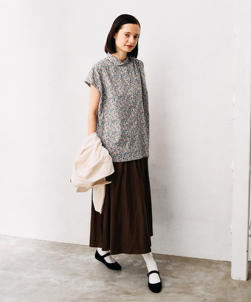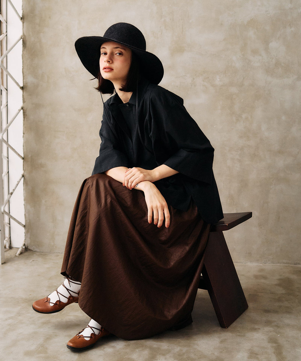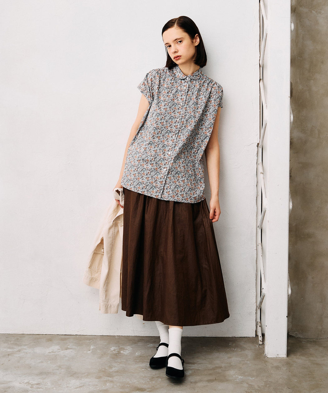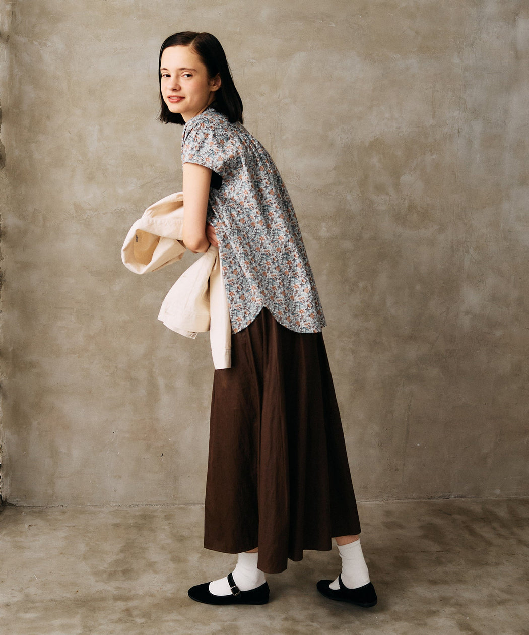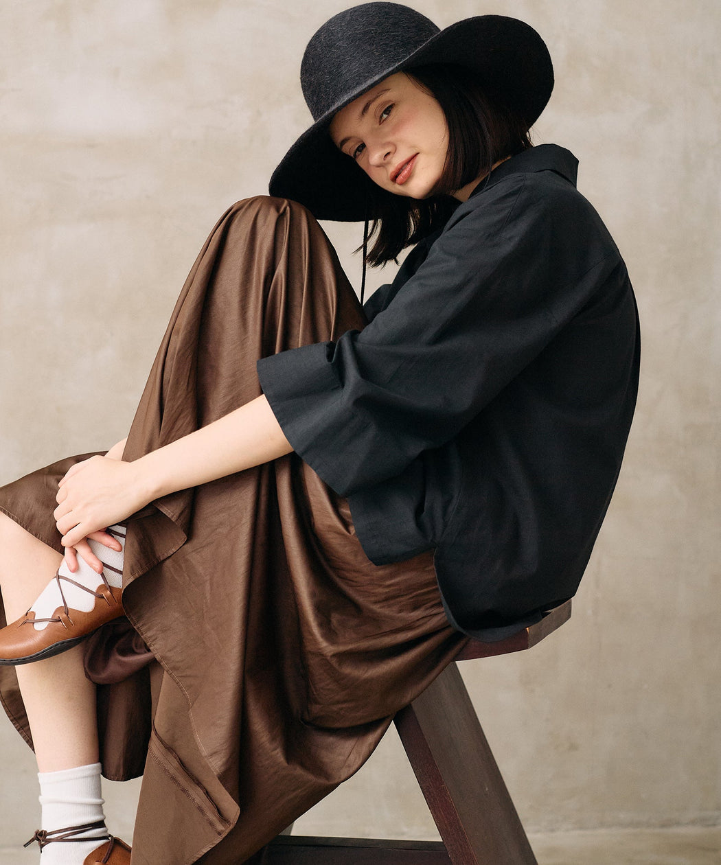 季節を問わない生地感で、春夏は軽やかに、秋冬はニットと合わせてシーズンレスで活躍する万能アイテムです。
