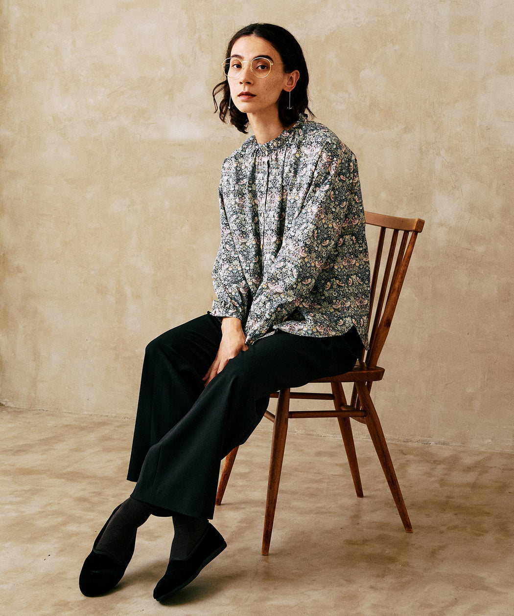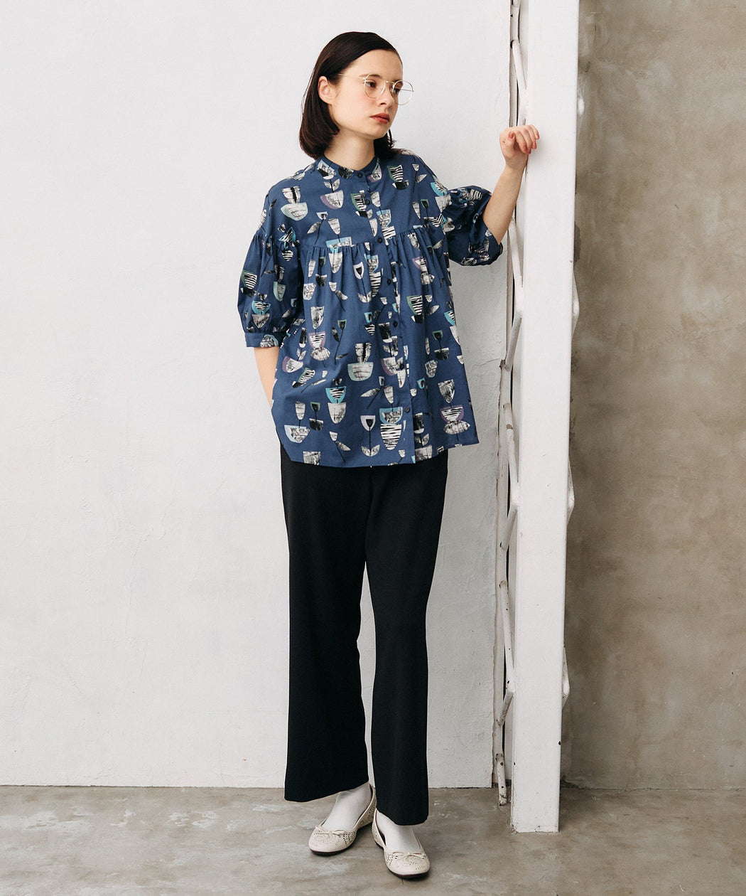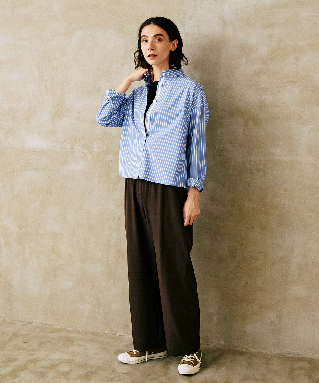 シンプルな無地のTシャツや、柄入りのカジュアルシャツはイージーパンツとの相性が良く、リラックスした雰囲気を演出できます。