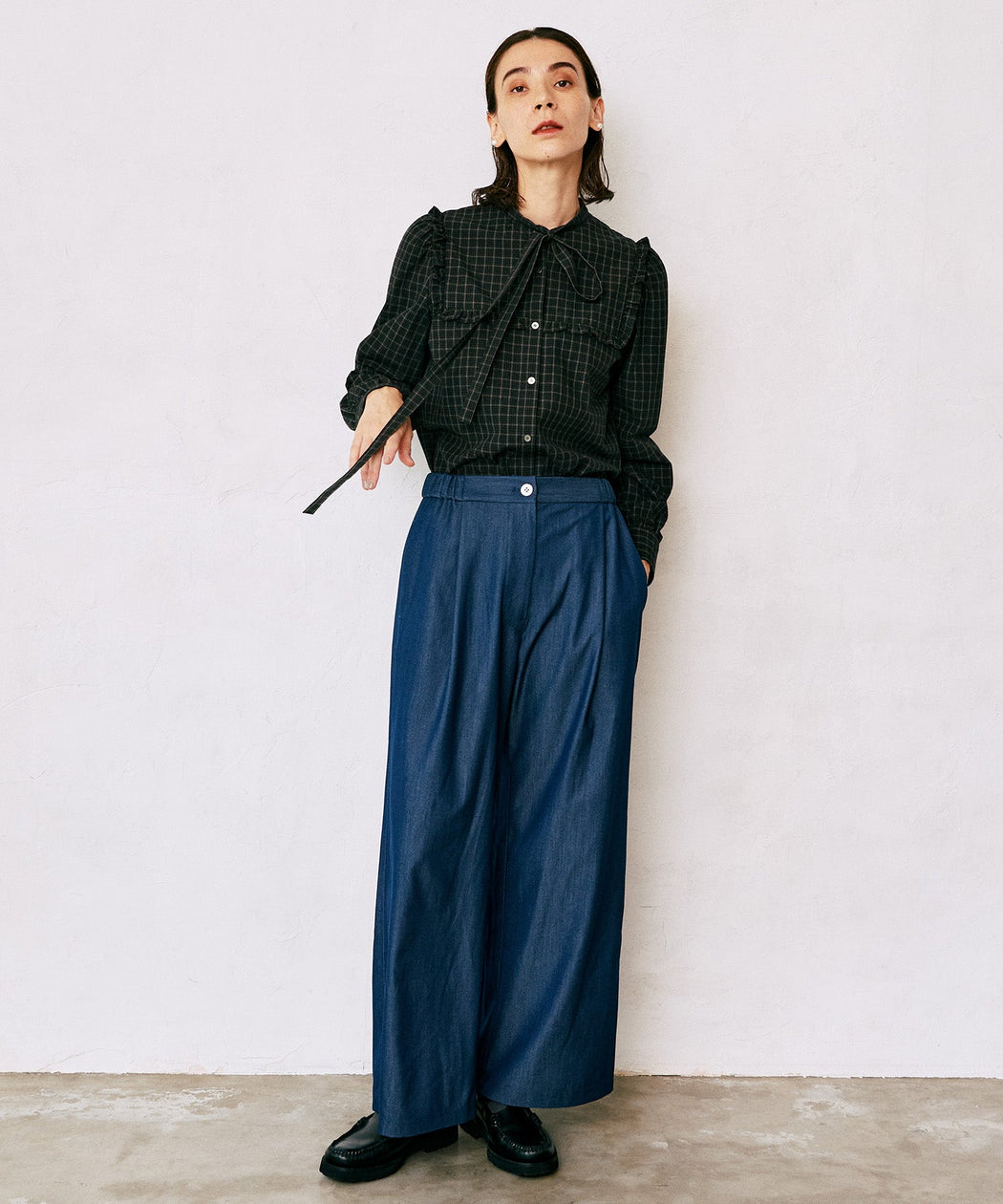 フリルブラウスを合わせて、フェミニンさを取り入れたフレンチカジュアルに。