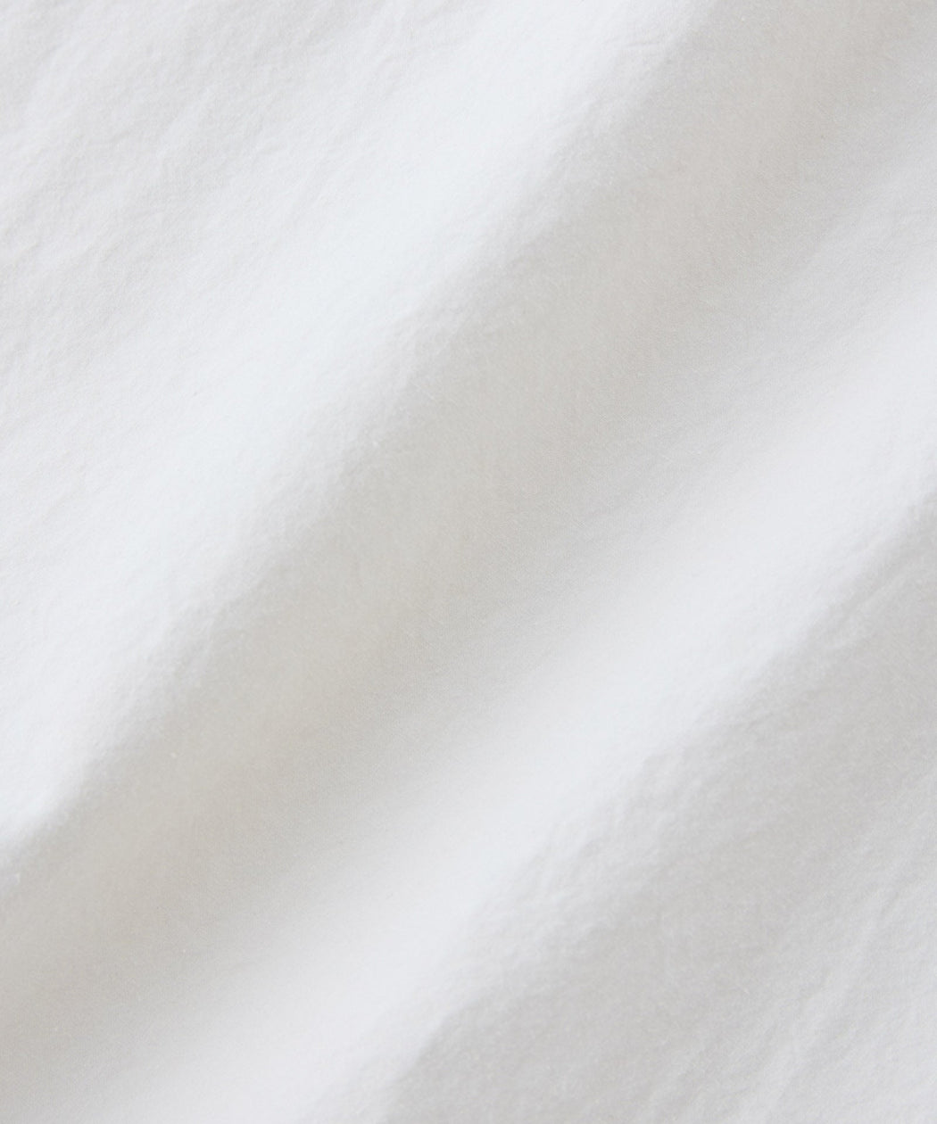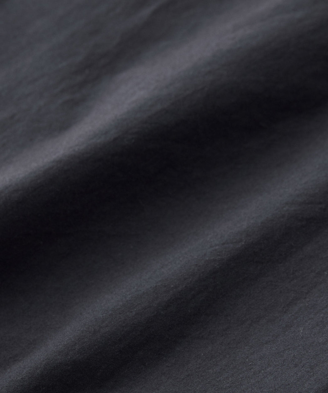 高密度に織り上げたブロード生地を時間をかけてゆっくりもみほぐして生地の膨らみやシボを最大限に出し、 樹脂を付けてワッシャー加工を加え、ヴィンテージ風の風合いに仕上げた素材を使用。