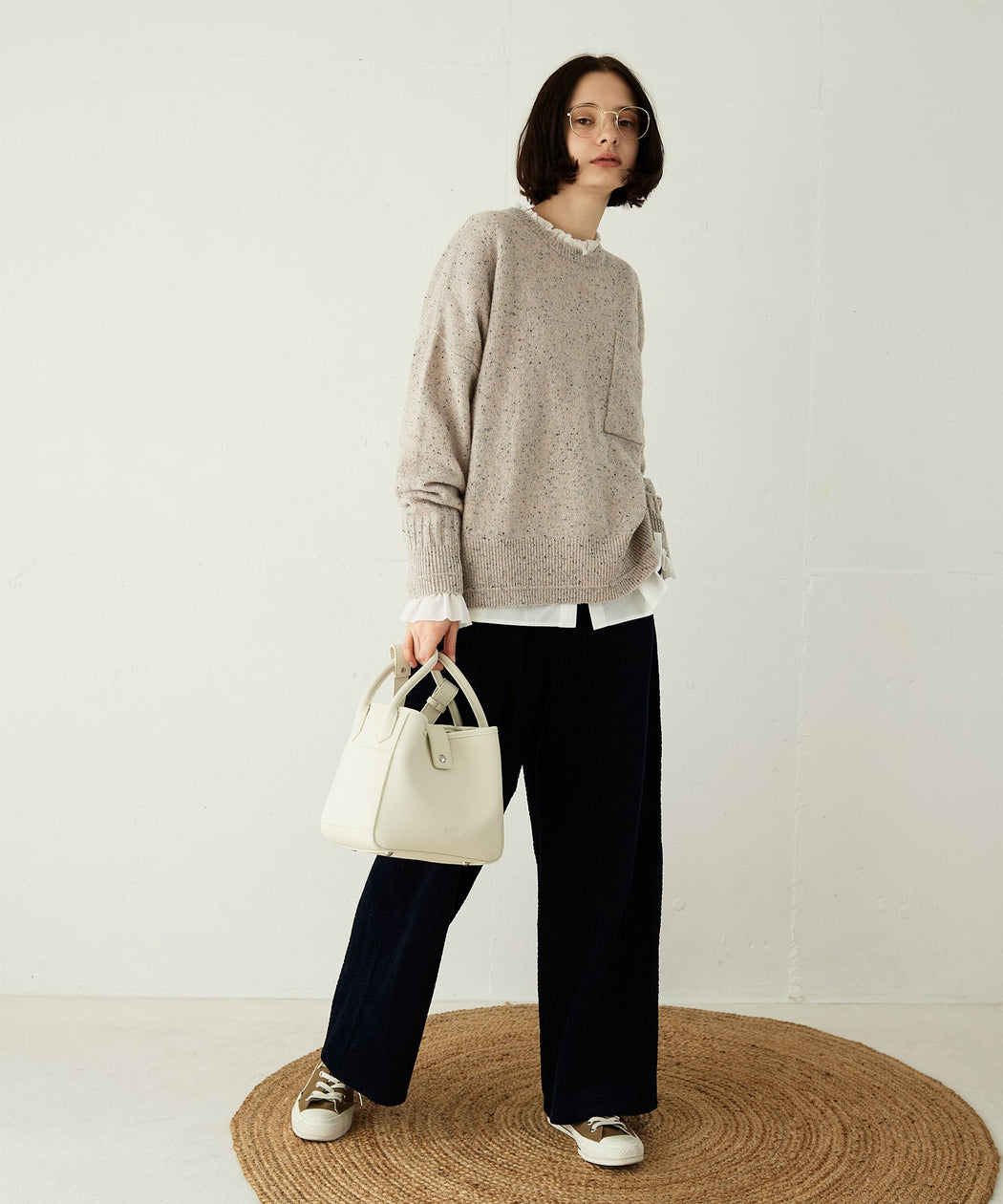 シンプルなニットを合わせると素材の上品さが際立ち、秋のきれいめカジュアルスタイルに。