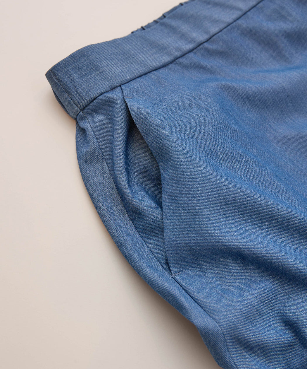 落ち感のある素材で着心地が良く、程よいAラインのトラペーズシルエットがどんなトップスともバランスよくまとまります。