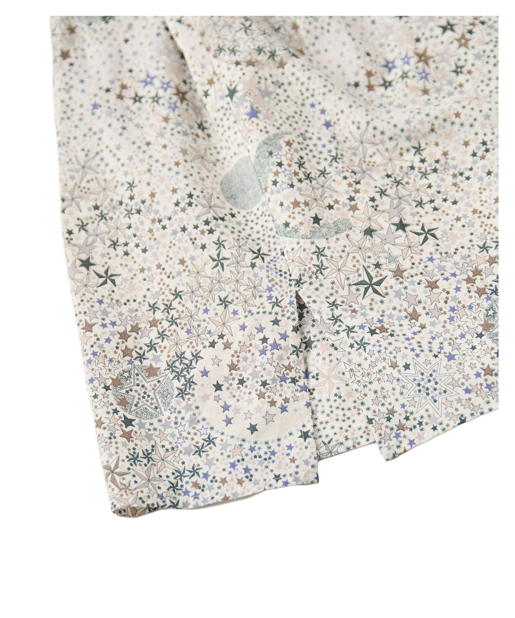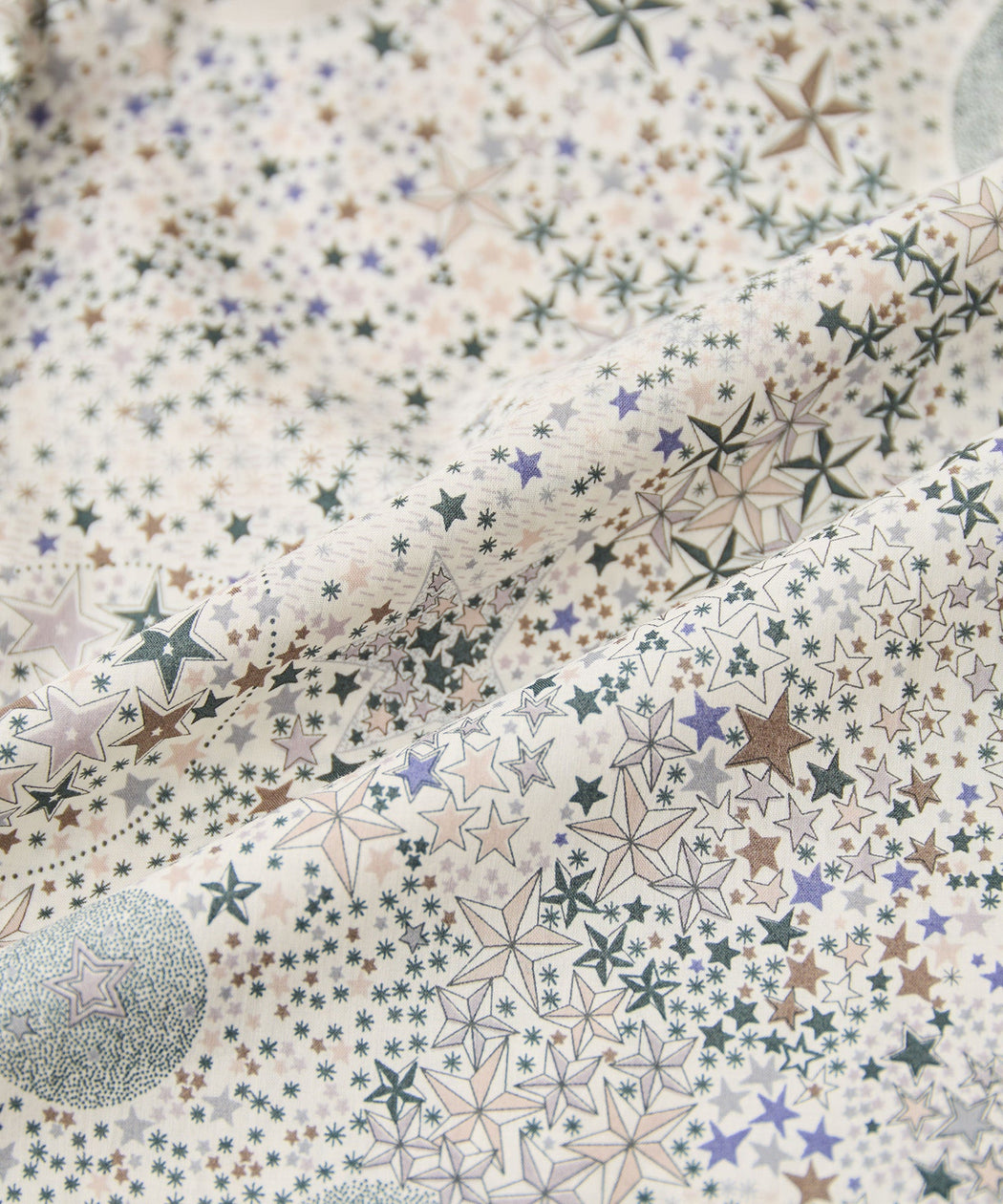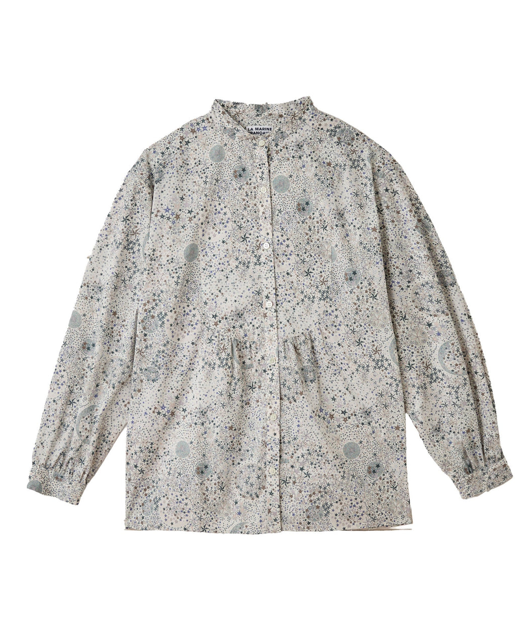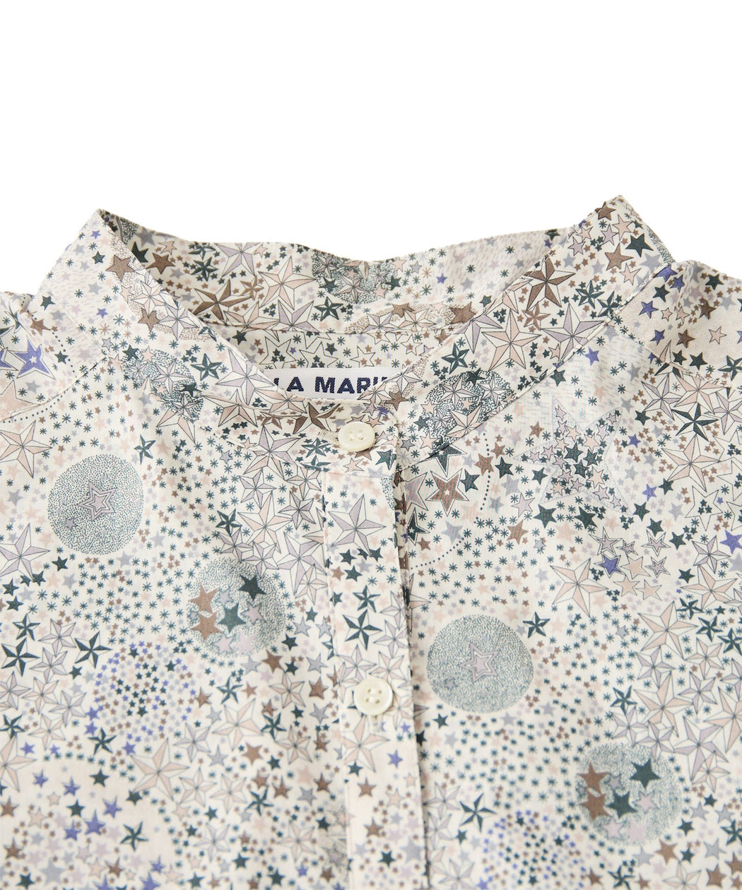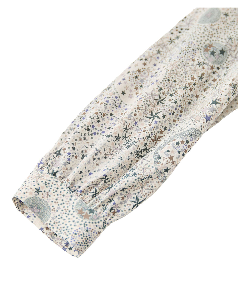 スタンド襟が上品な印象を与えるリバティプリントブラウス。