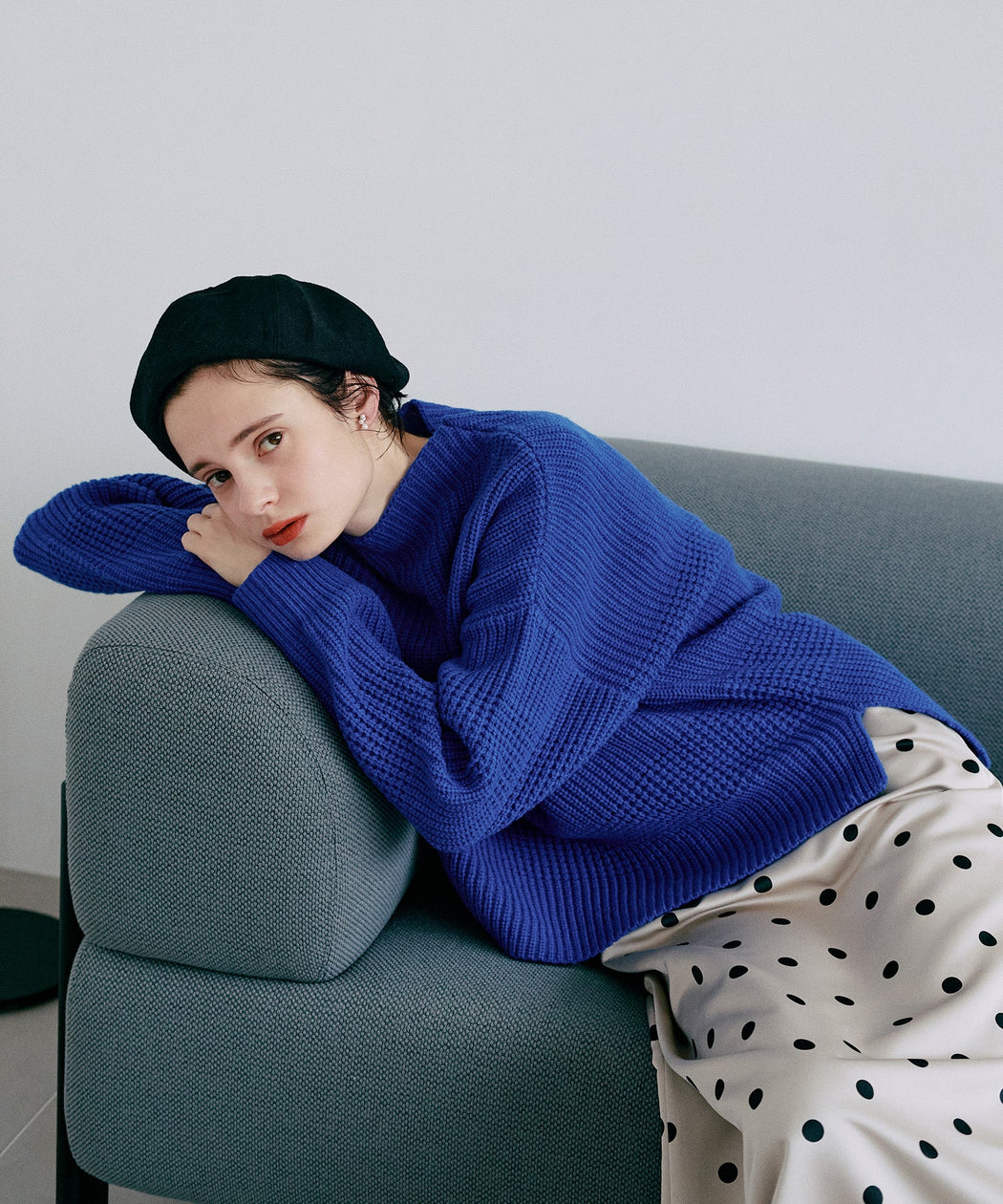 ボトルネックの襟元やワイドなシルエットで1枚でサマになるデザイン。