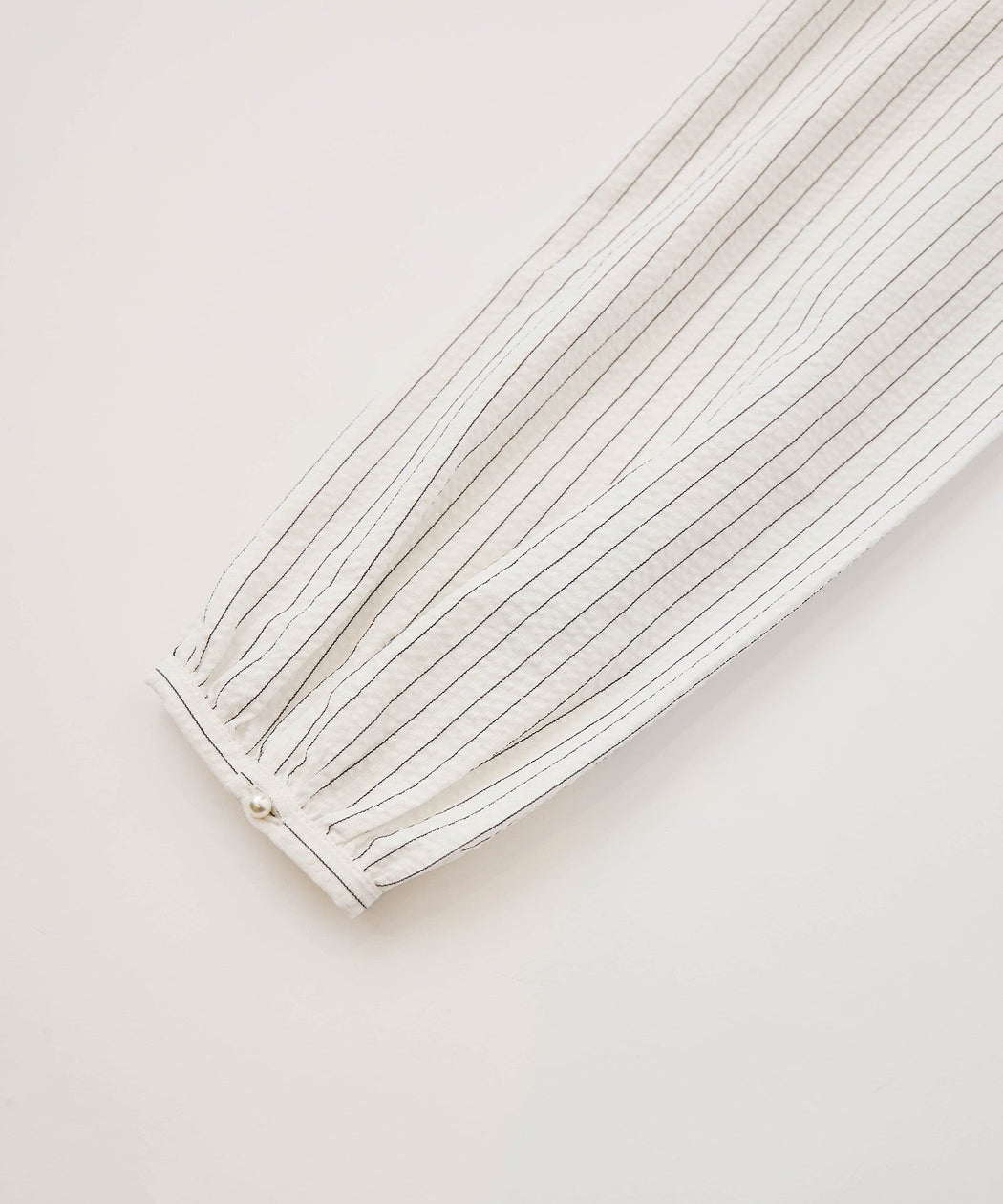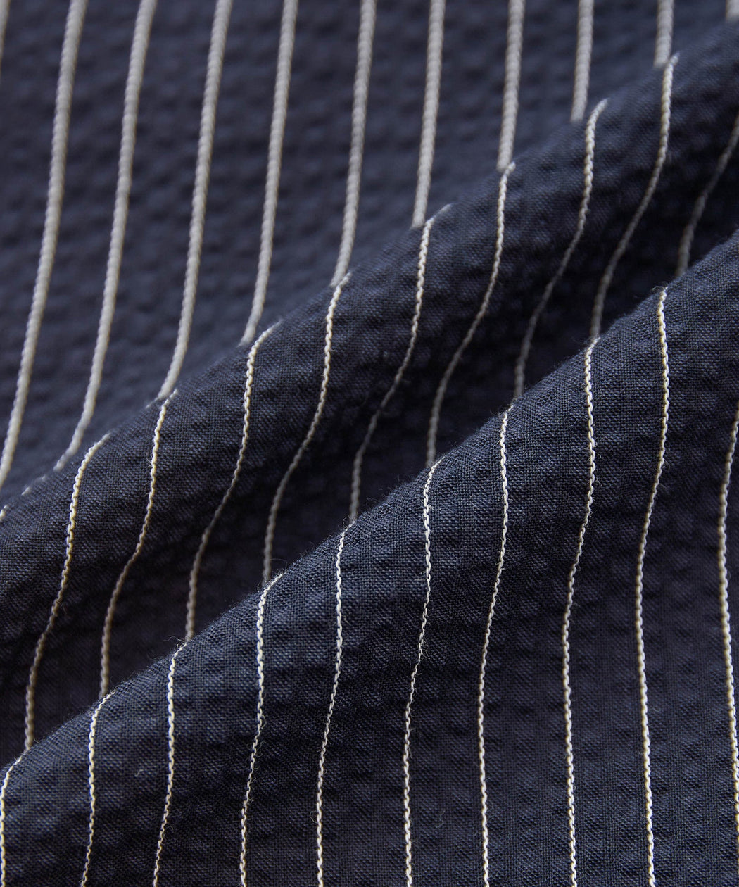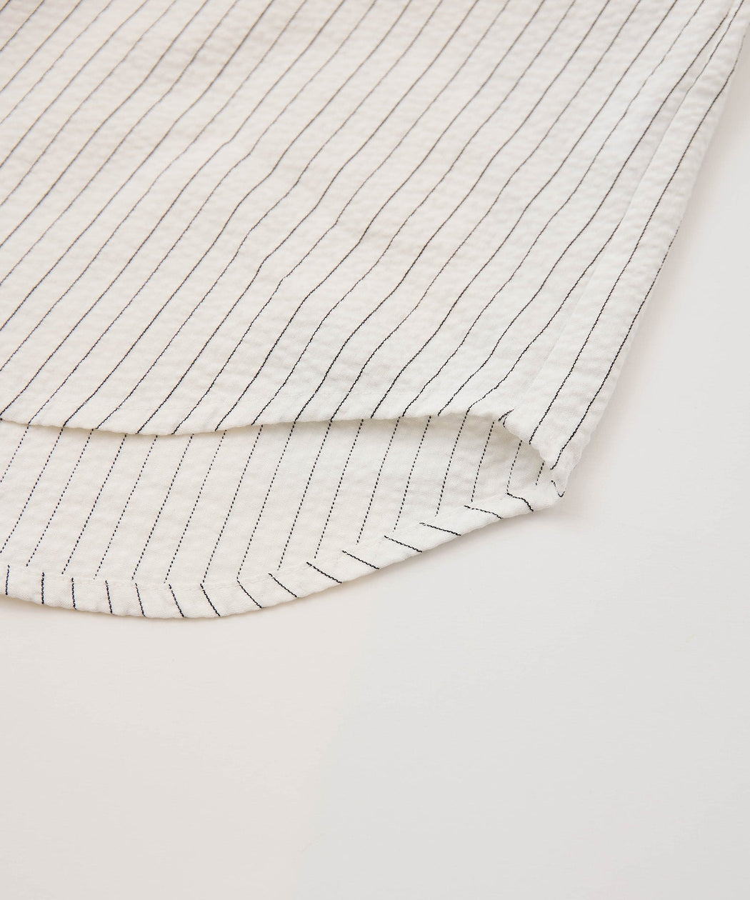 肌離れの良いサッカー素材と細いストライプで、カジュアルになりすぎず、きれいめスタイルにも馴染む1枚です。