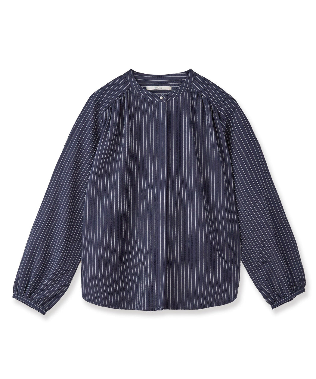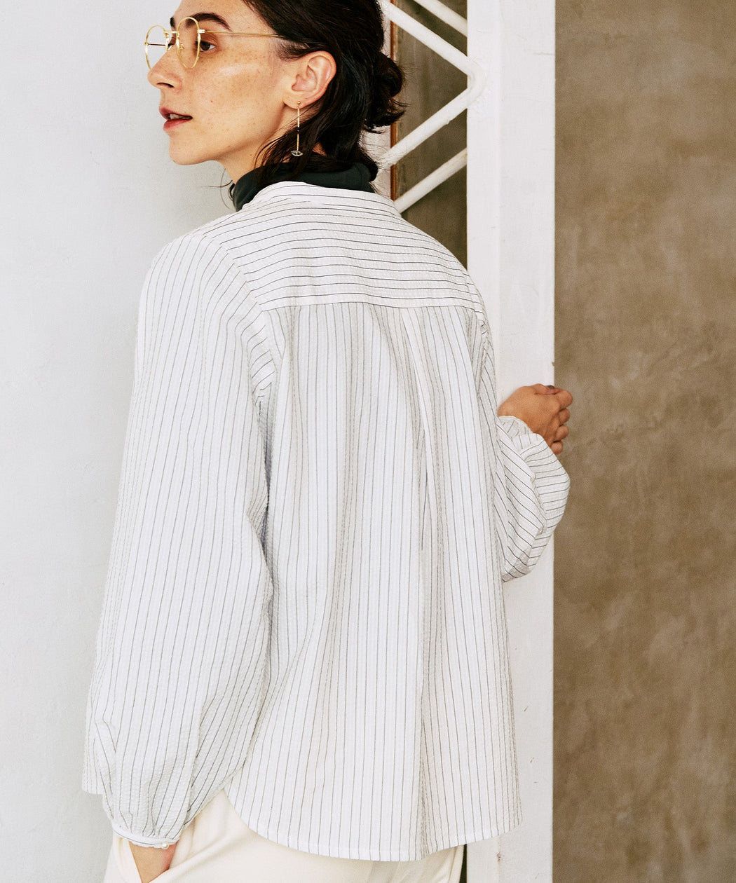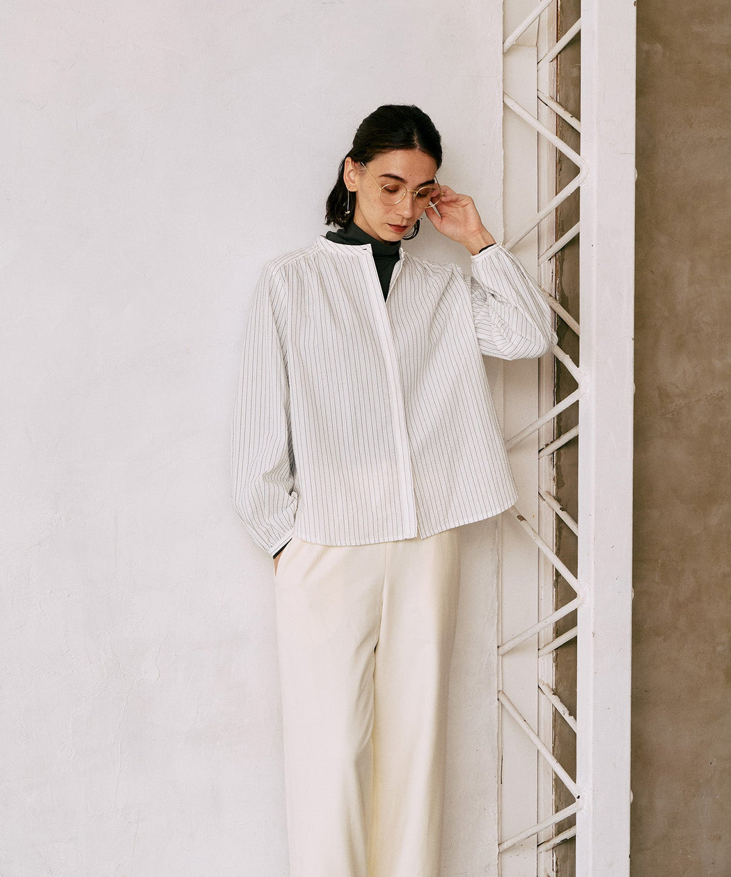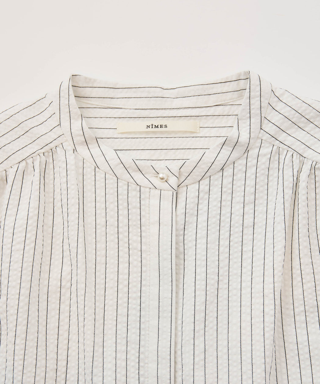 NÎMES定番のスタンドブラウスに今シーズンはストライプ柄をセレクト。