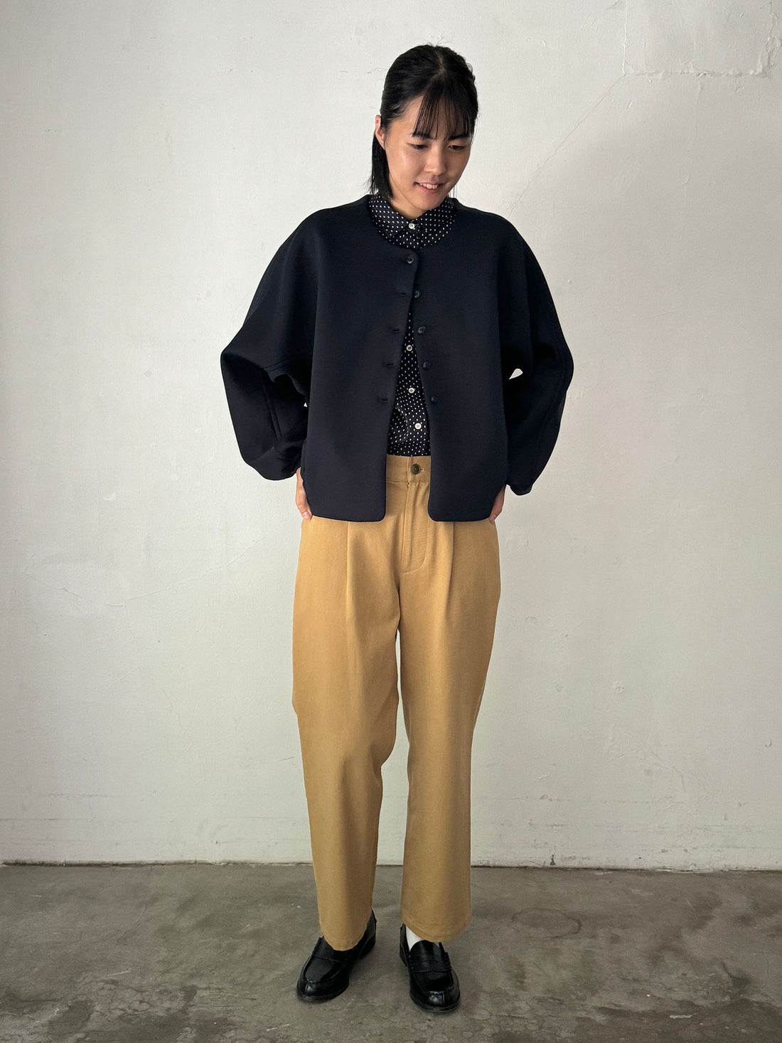 紺ブレを合わせてオフィスカジュアルにも対応できるキレイめコーデに。