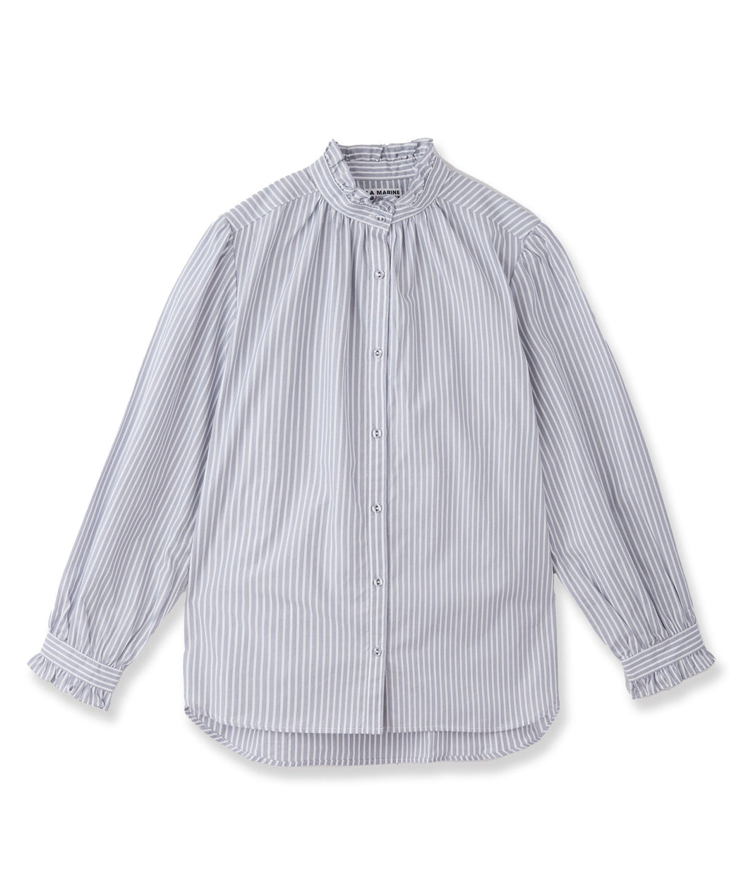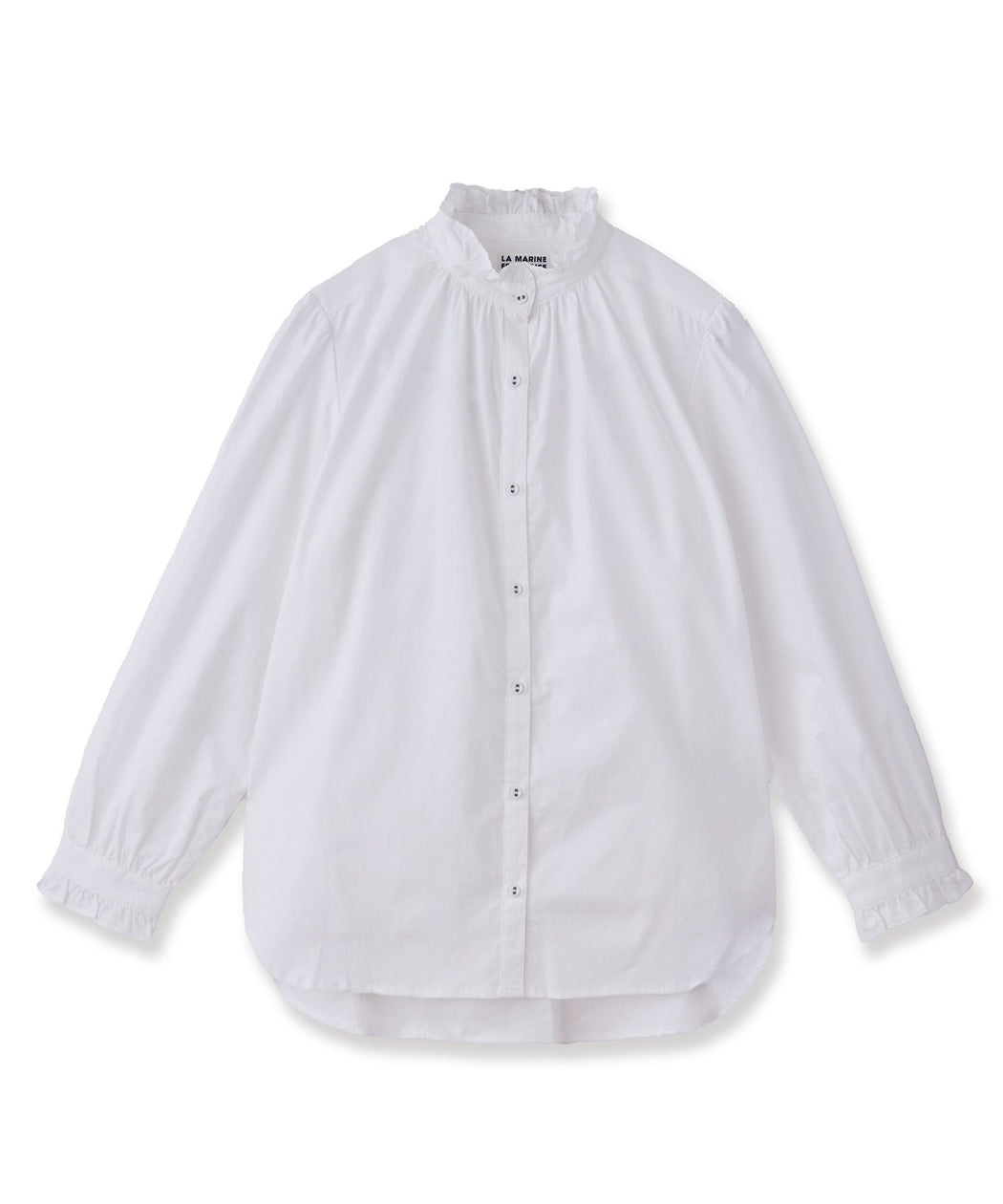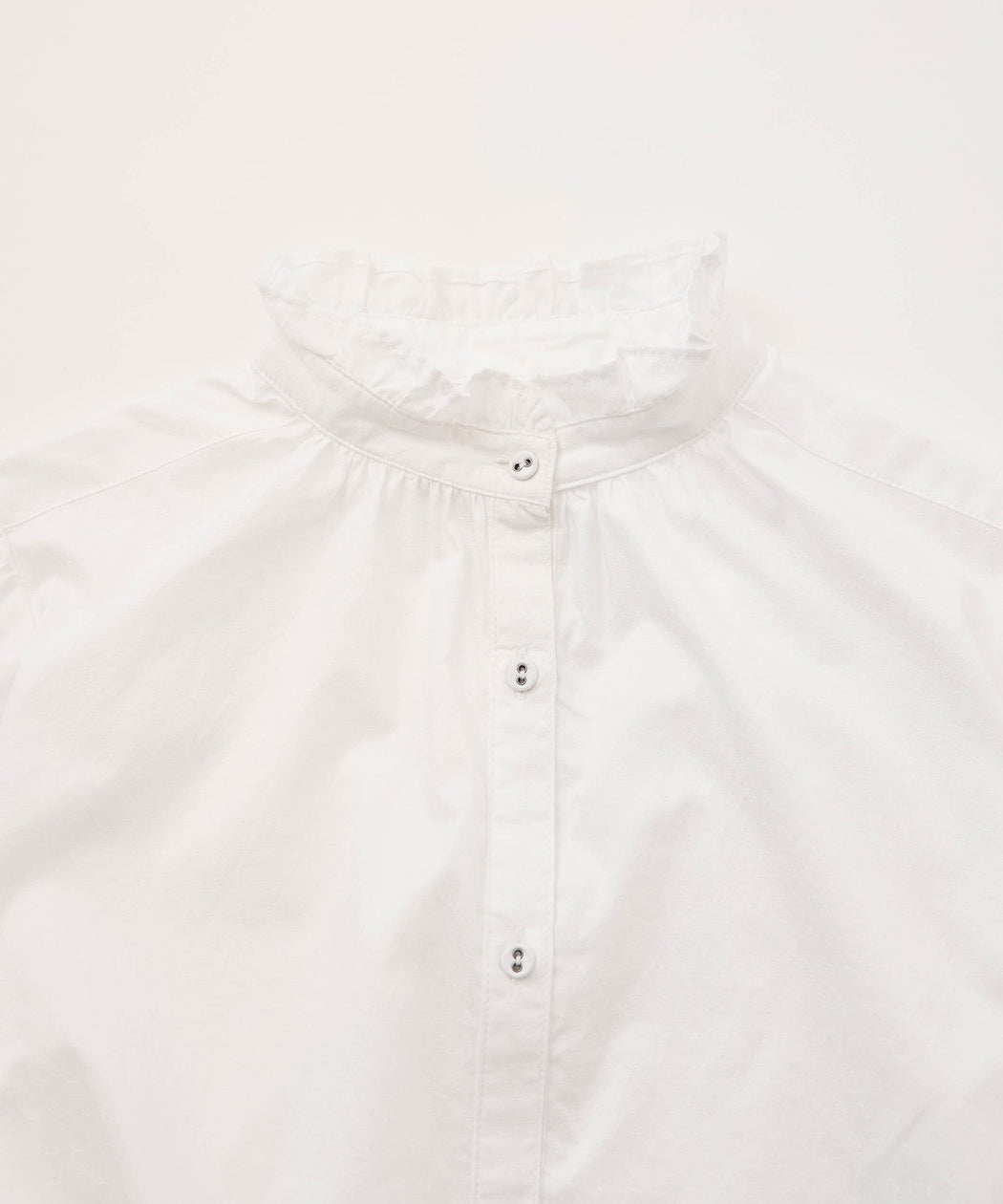 少し高めのスタンド襟にフリルをあしらった、甘すぎない大人のフリルブラウス。