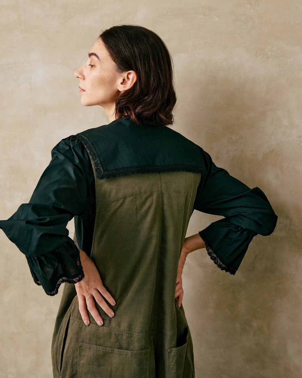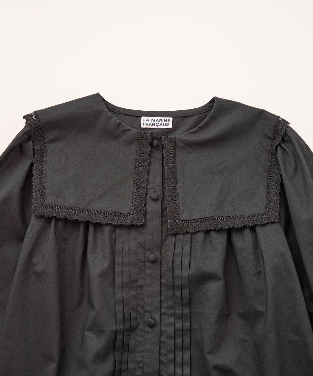 大きめのセーラー襟に施した華やかなレースが目を引きます。