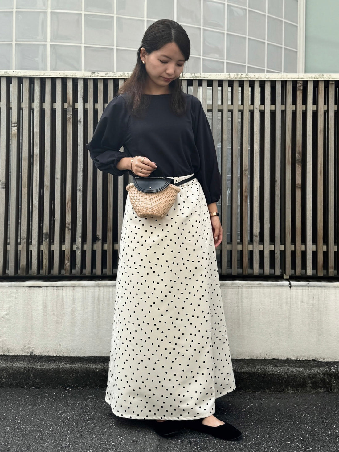 今年トレンドのクラッシックな雰囲気のドット柄のスカート。