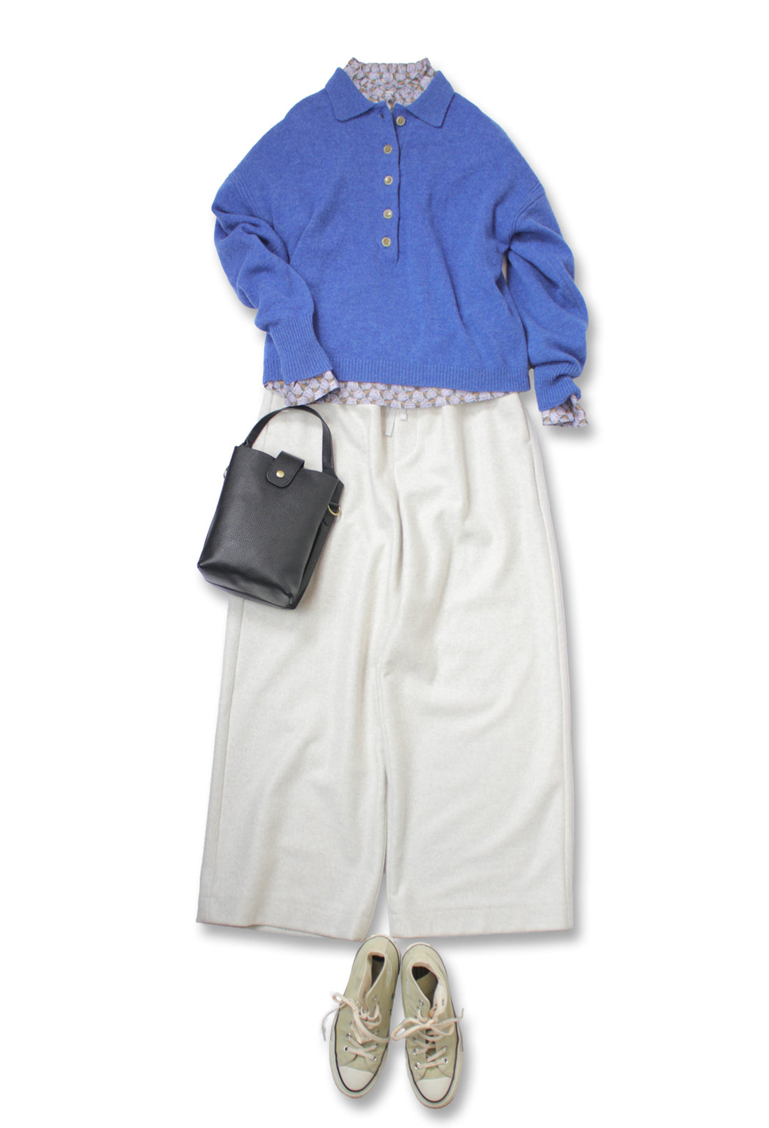 シンプルなカットソーやニットと合わせて、パンツのワイドシルエットを引き立てたスタイリングに。