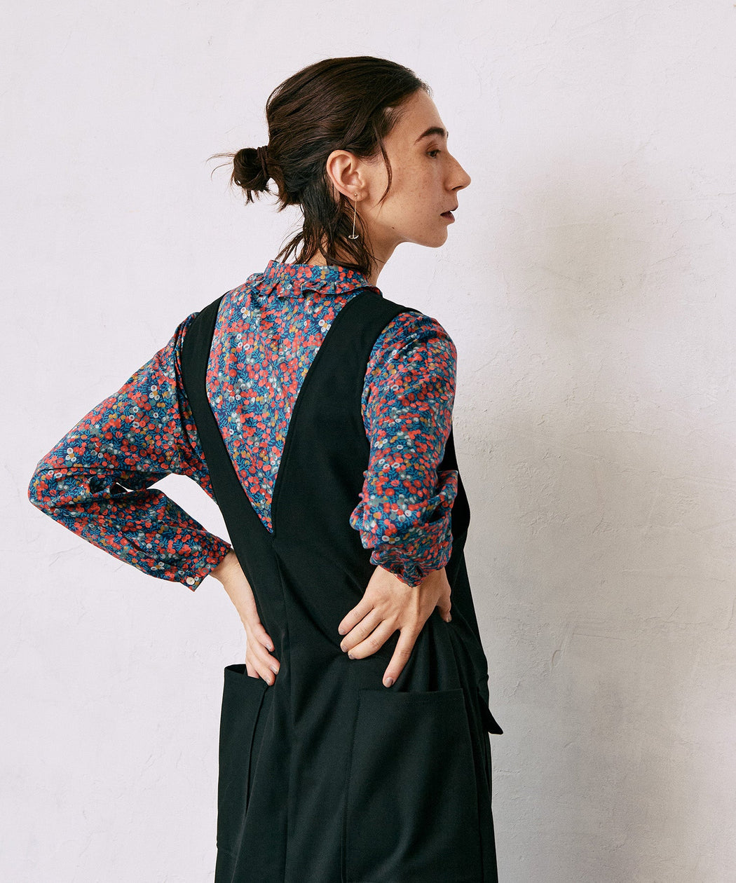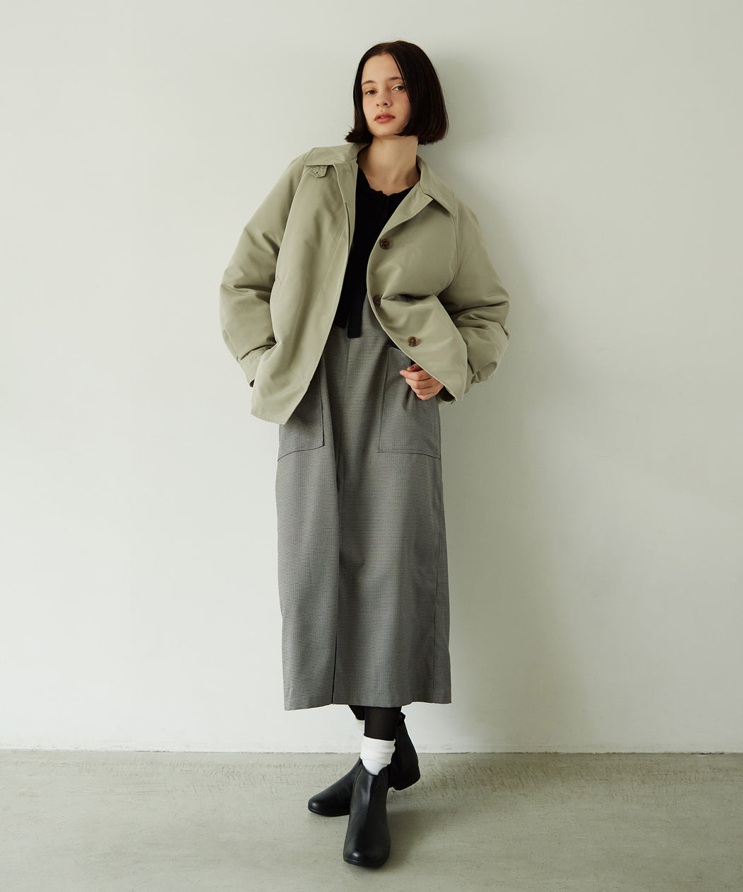 程よい落ち感があり、きれいめな表情を持つ素材で仕立てたジャンスカ。
