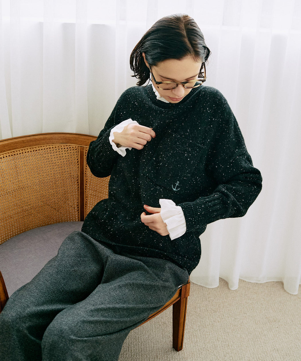 裾や袖口に編地変化をつけ、ベーシックな中にもさりげない遊び心をプラス。
