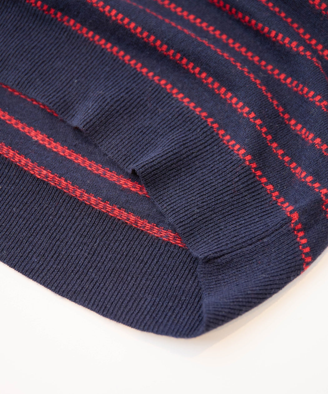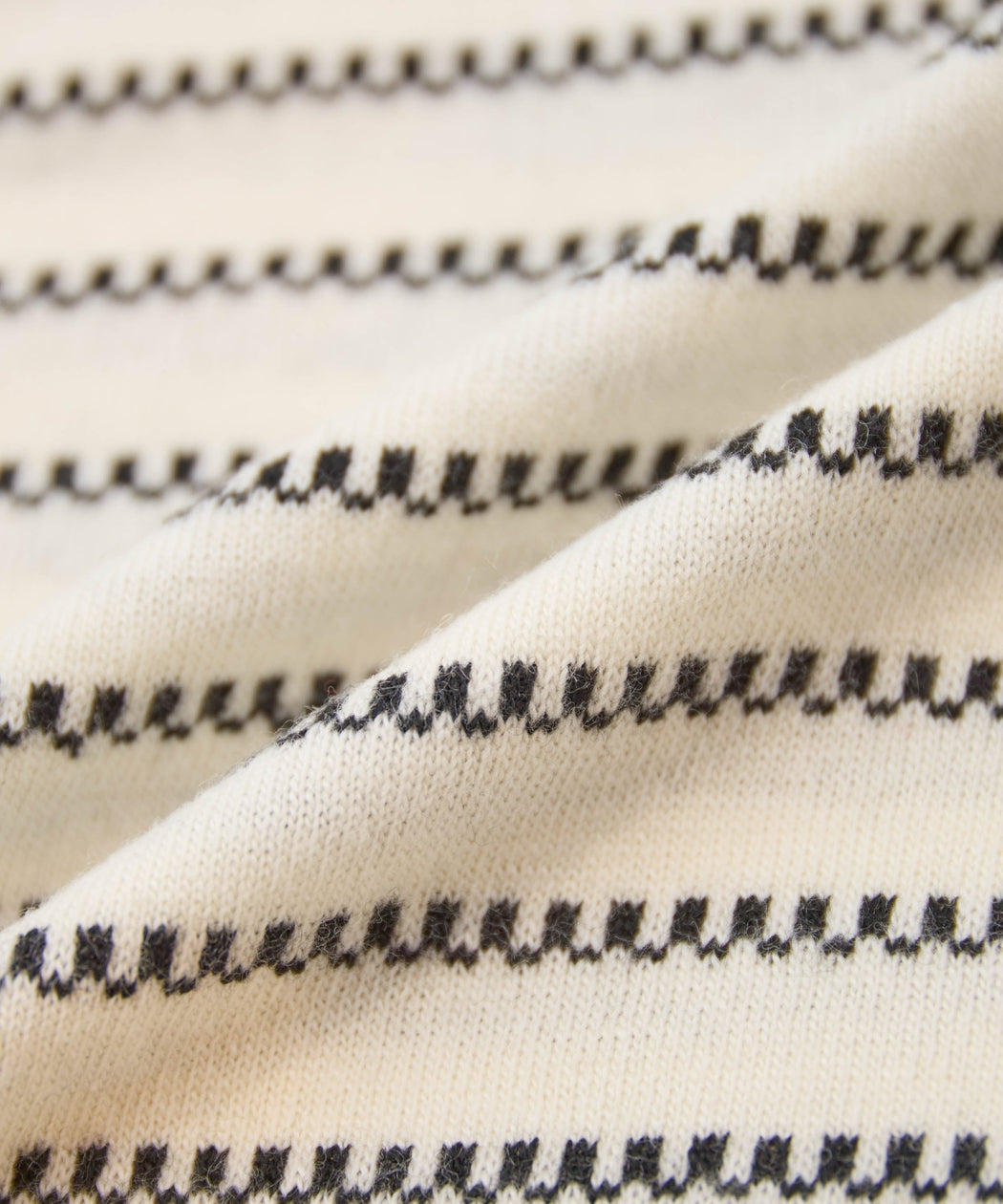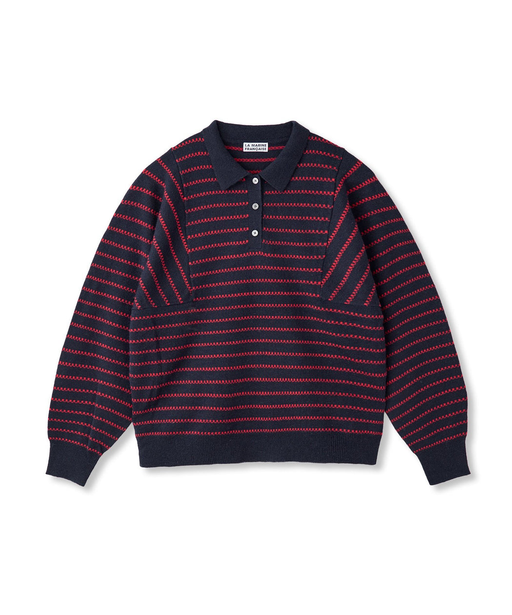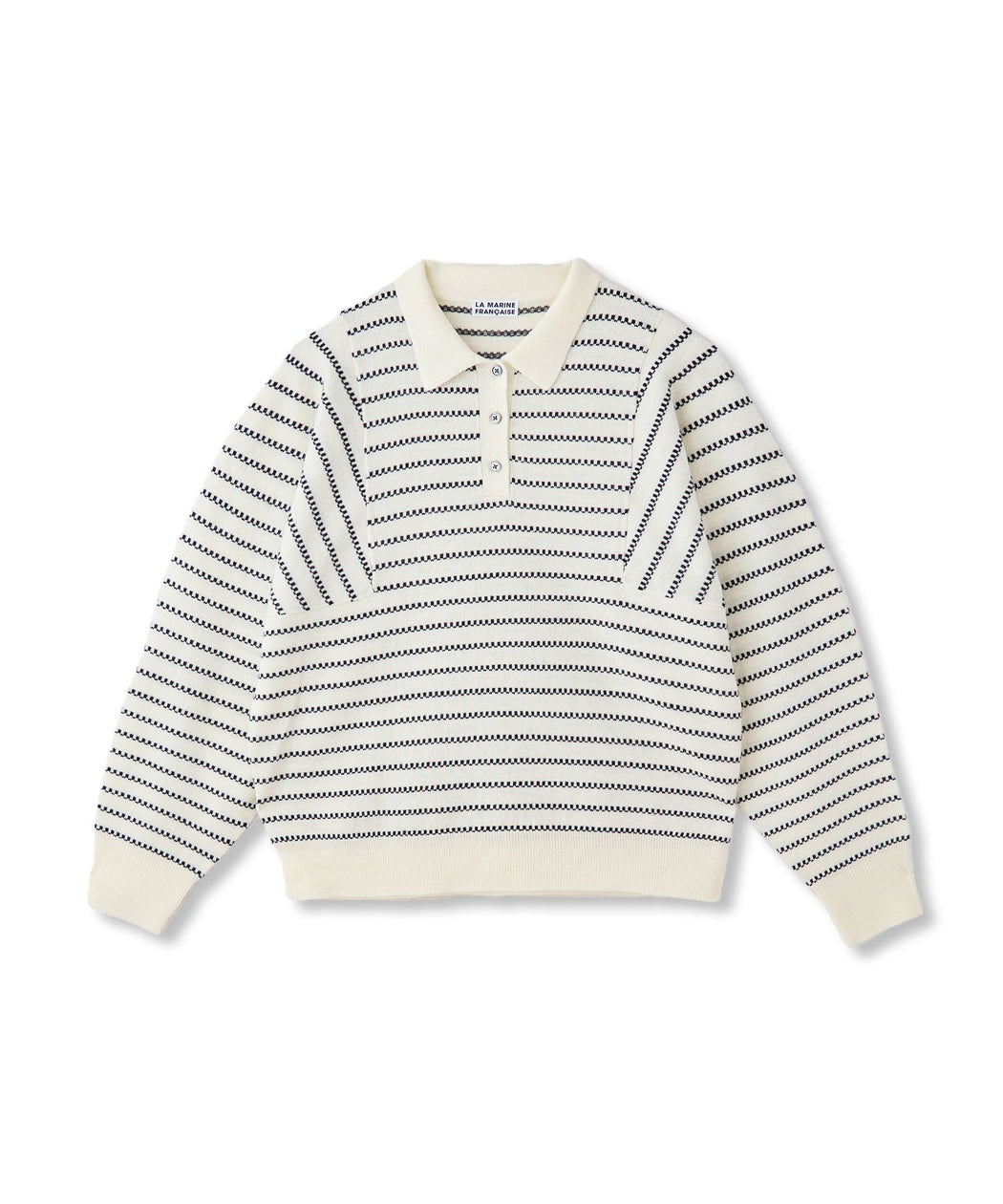 格子状のジャガードをボーダーに並べた、表情豊かなポロプルオーバー。