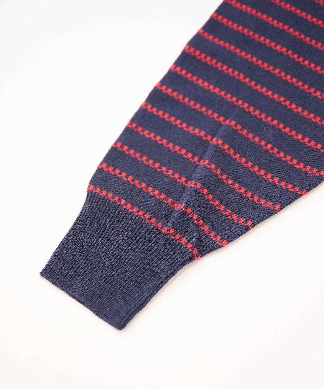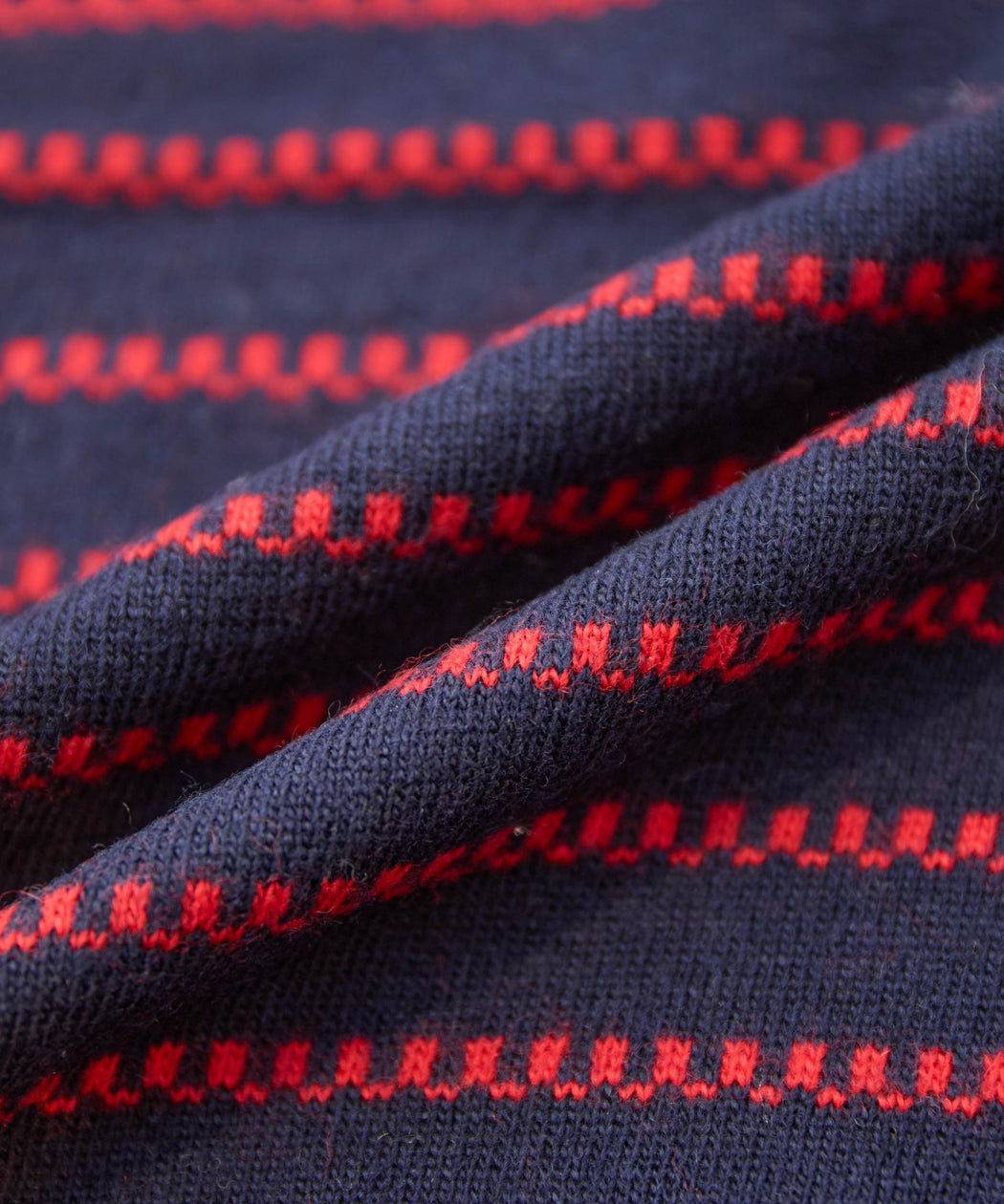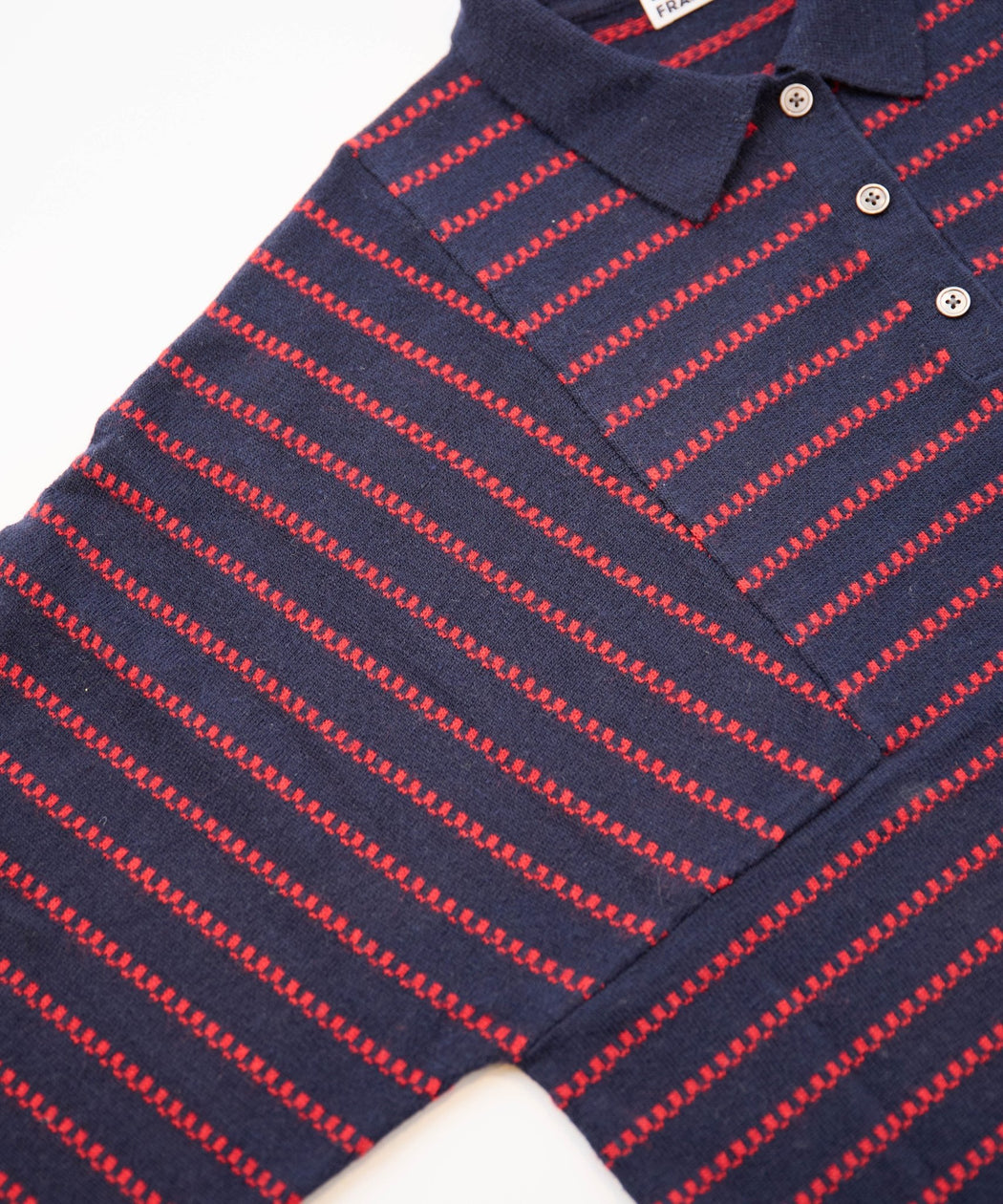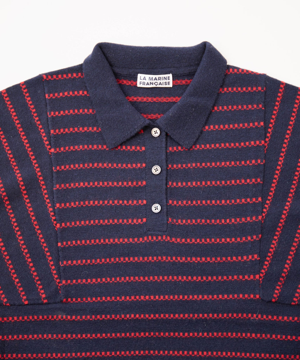 格子状のジャガードをボーダーに並べた、表情豊かなポロプルオーバー。