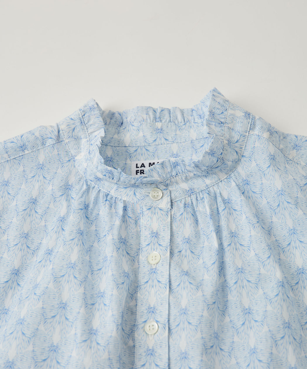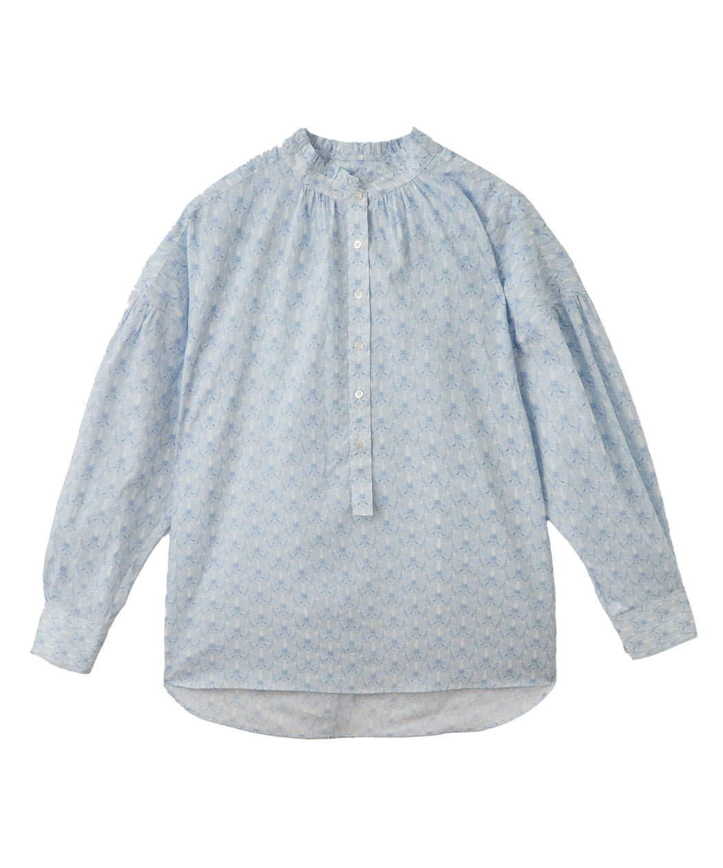 首元と肩まわりに施したフリルとギャザーが、顔まわりをやさしく彩り、1枚で着映えするデザイン。