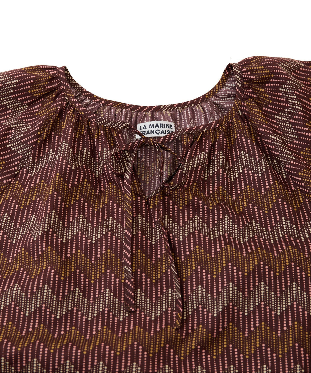 首元はギャザーをたっぷり寄せたデザインで、やわらかなドレープが女性らしい印象に。リボンディテールがさりげないアクセントになり、結び方次第で雰囲気のアレンジも楽しめます。