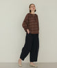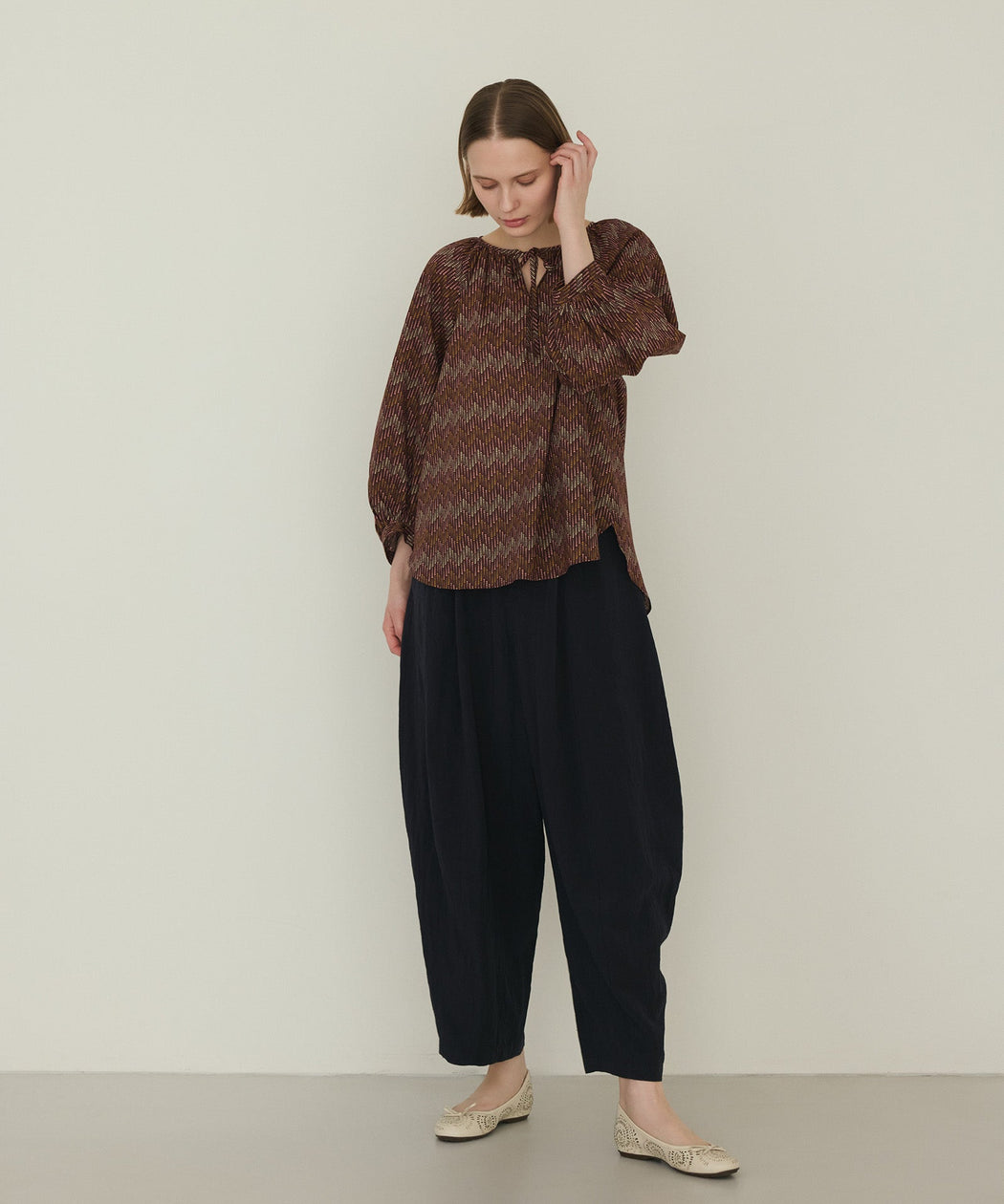 丸みのあるシルエットのパンツと合わせて、やわらかな雰囲気を活かしたリラックススタイルに。ブラウスの華やかなプリントが引き立ち、シンプルなボトムでも着映えするコーディネートが完成します。