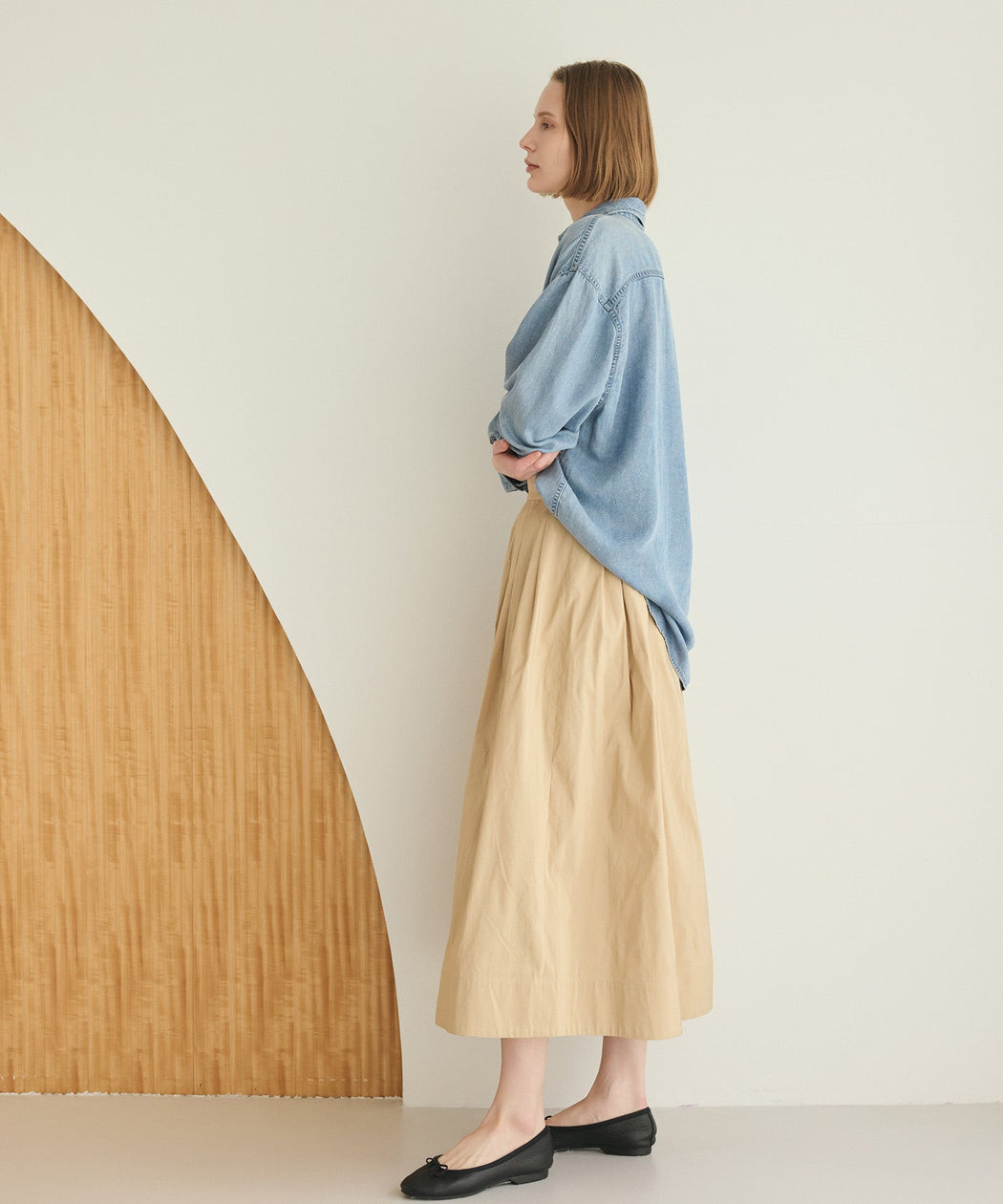 程よいハリのある素材感で、シルエットをきれいにキープしつつ、歩くたびに軽やかな表情を演出。