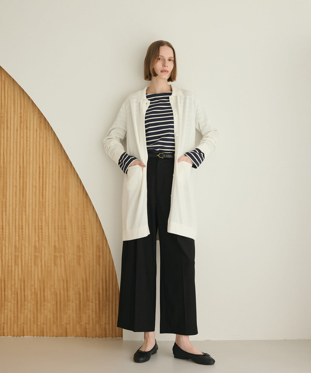 シャツなどのフォーマルコーディネートはもちろん、ボーダーカットソーなどのカジュアルコーディネートにも合わせられる優秀ボトムは、ワードローブに加えたい1本です。