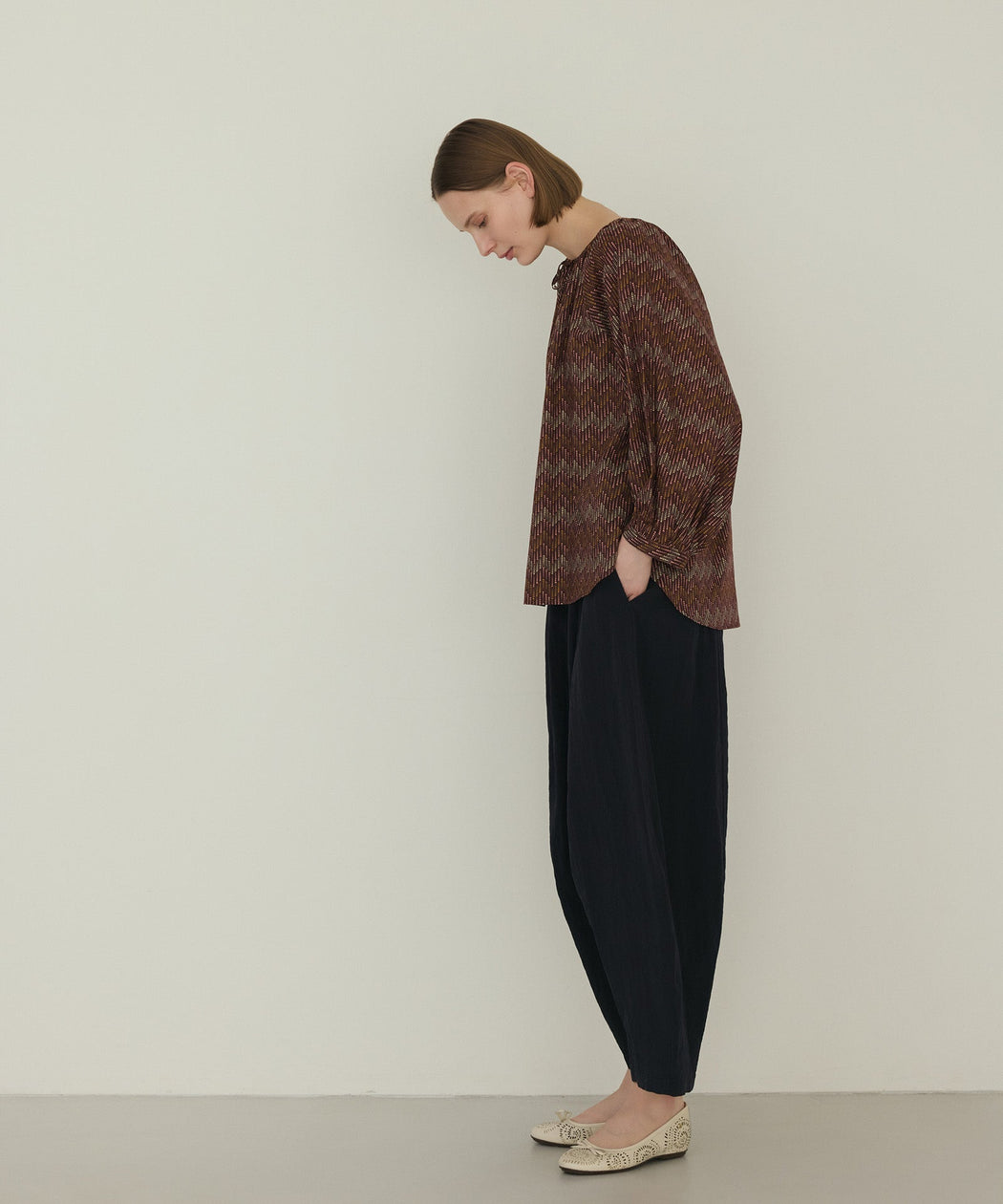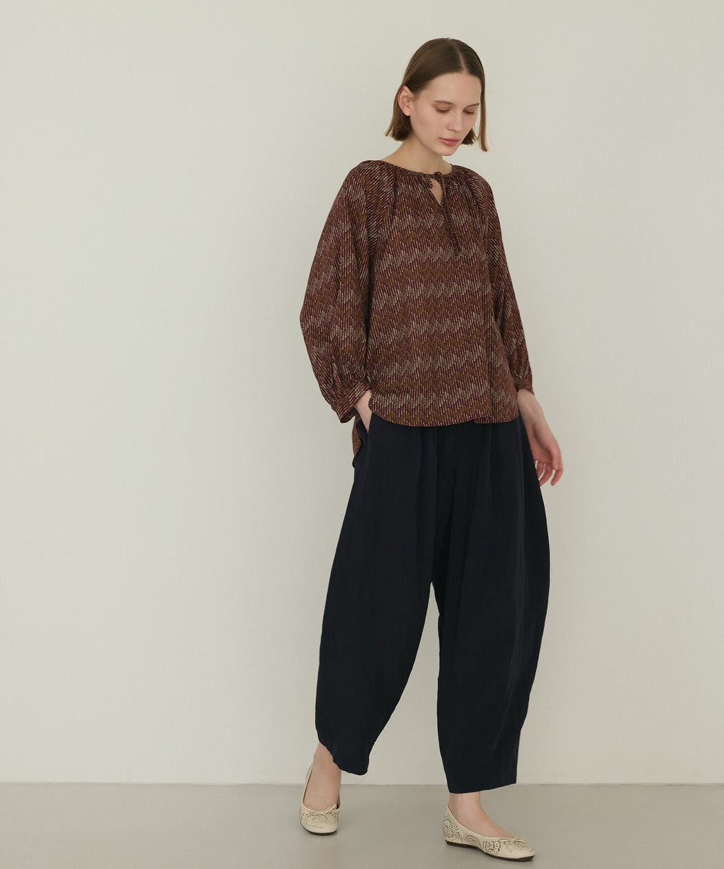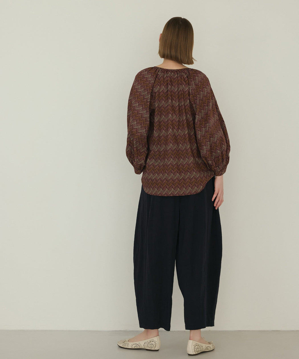 柄ブラウスと合わせた華やかなコーディネート。丸みのあるシルエットがトップスの存在感を受け止め、バランスの取れた大人のカジュアルスタイルに仕上がります。