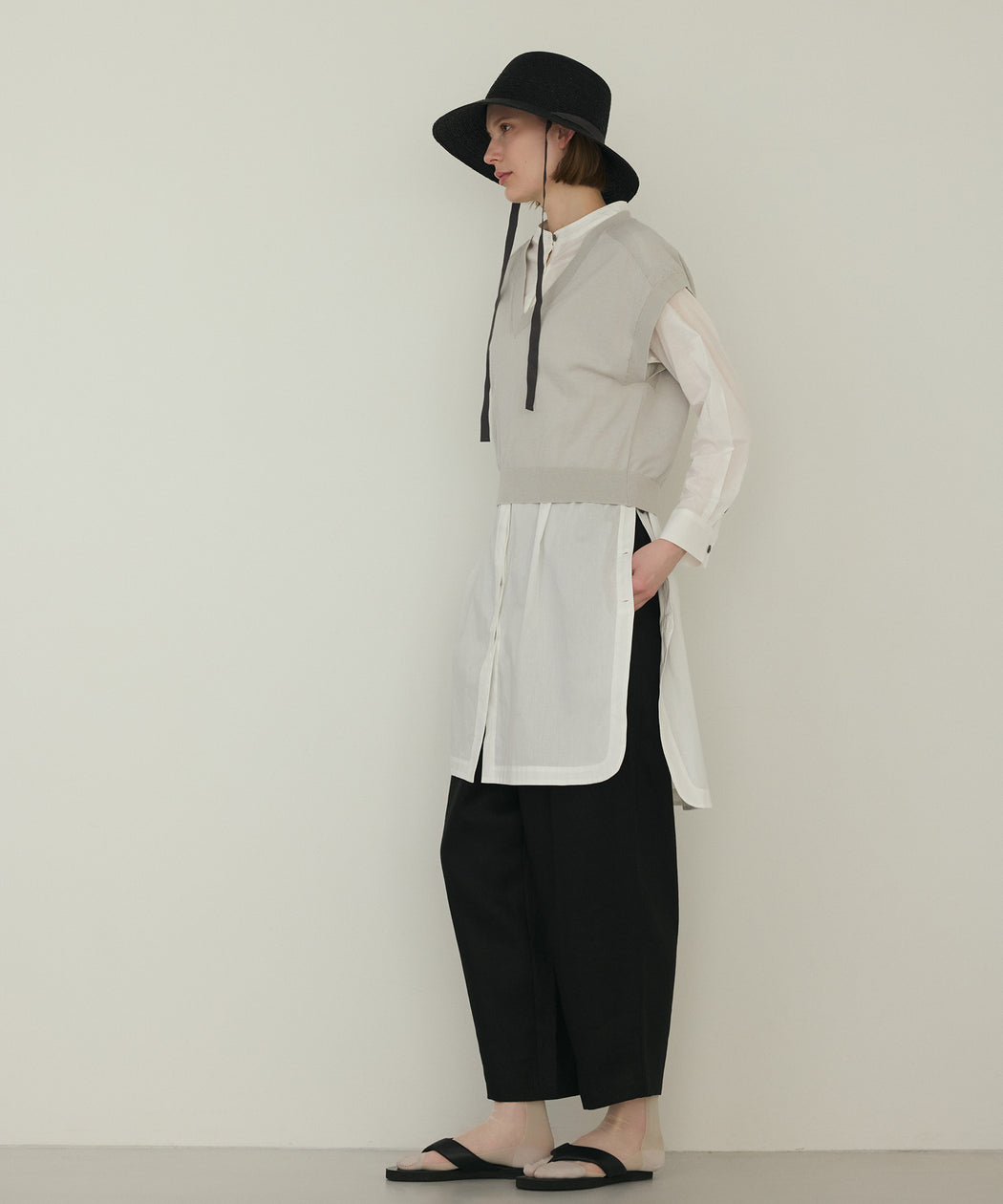 ロングシャツと合わせて、軽やかなレイヤードスタイルに。クロップド丈が全体をすっきりとまとめてくれます。