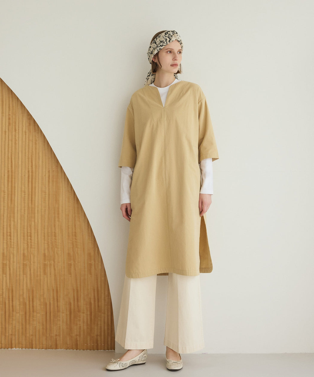 程よくゆとりのあるシルエットと、体のラインを拾いにくいストンとした落ち感で、リラックスしながらも大人らしい印象に仕上げました。