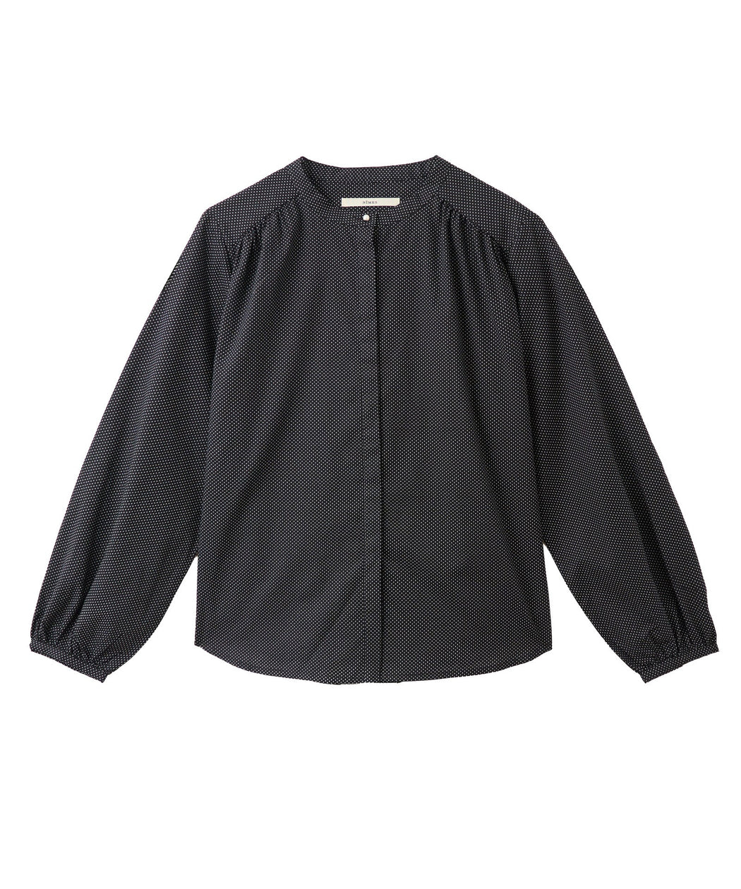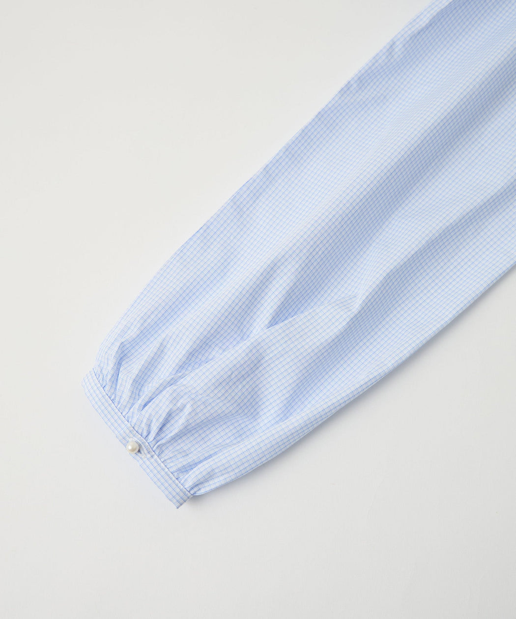 襟元にあしらった小粒のパールが上品なアクセントになったブラウス。