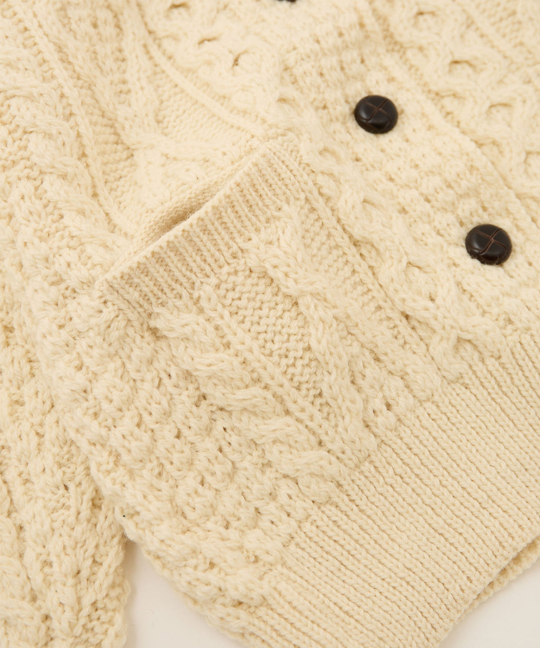 ざっくりとしたアラン模様に、フロントのコロンとしたボタンが可愛らしいデザイン。